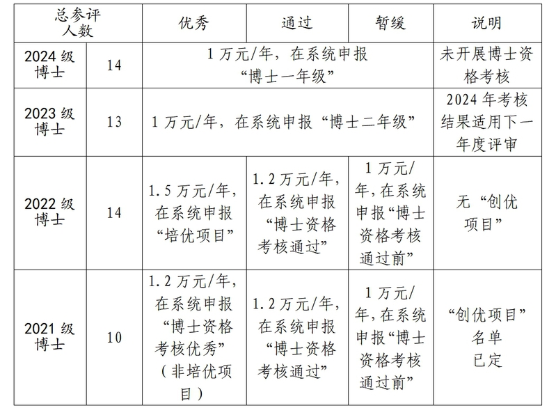 1.2024级、2023级博士:不再设定等级和比例,在资格考核通过前每人1万元,2023级博士虽已考核结束,但考核结果用于下一年度学业奖学金评选。