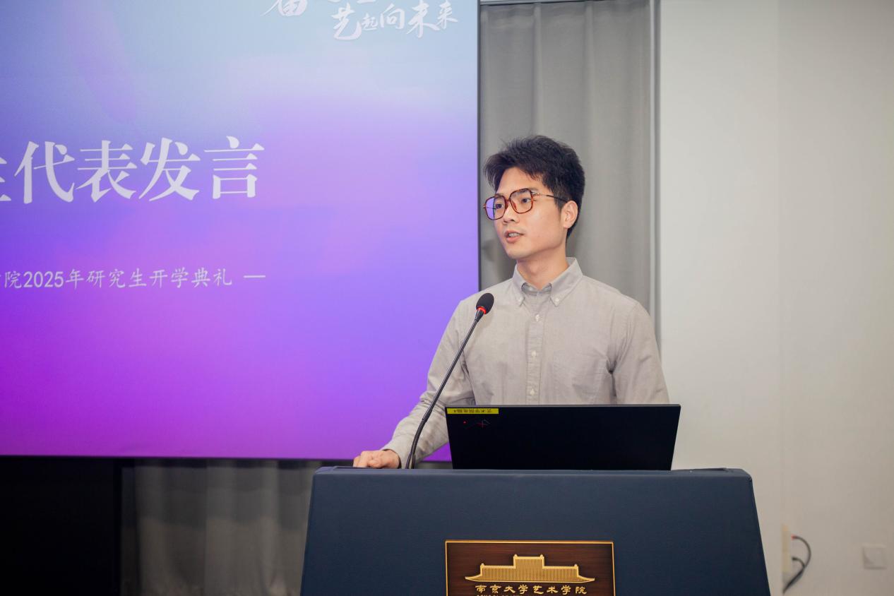 在校生代表、2021级艺术文化学专业博士研究生郑钲同学与新生们分享了自己在南大求学的体会与感悟。他以“过来人”的身份,鼓励大家珍惜学院丰富的学术资源与交流机会,同时勇敢面对未来可能遇到的迷茫与挑战。他谈到,艺术让我们与历史对话、与世界相连,在孤独与坚持中不断接近真理。他以“善良”、“诚实”、“永不相忘”寄语新生,希望每一位同学都能在桃花坞 踏实求学、真诚待人,绘制出属于自己的精神地图。
