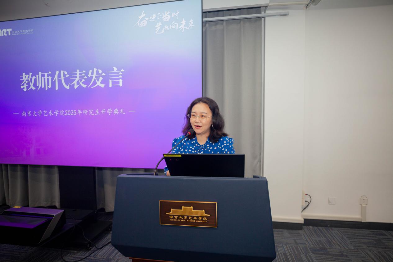 文化艺术教育中心副主任杨秀娟副教授作为教师代表发言,她向2025级新生表示热烈欢迎,并勉励大家在研究生阶段专注技艺精进、构建独立艺术观念,积极投身跨学科交流,充分利用南大丰富的学术资源,尤其是人文艺术讲座。她强调,艺术工作者须保持对时代的敏锐感知,超越象牙塔、承担时代使命,让创作兼具个人语言与现实关怀。南大桃花坞