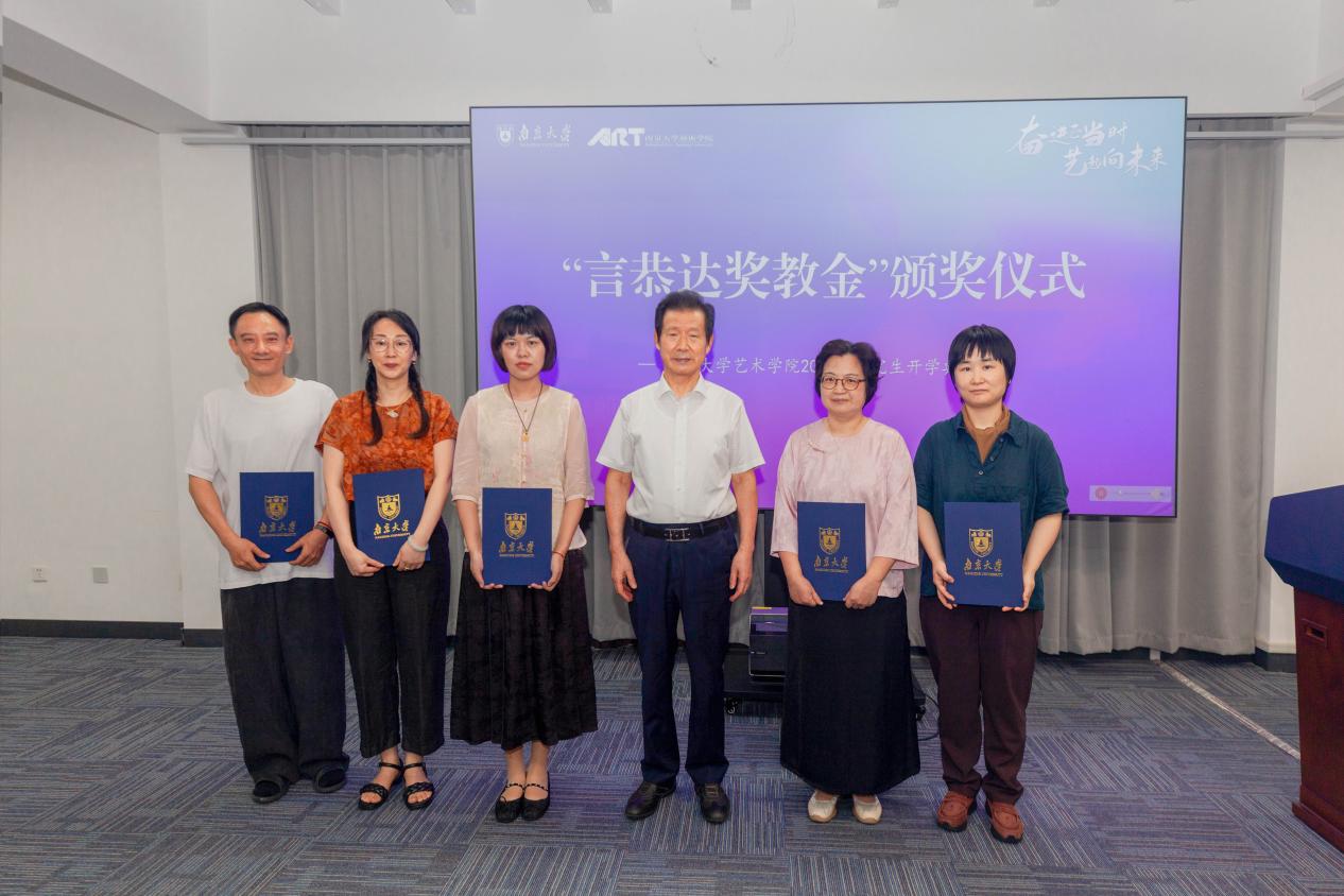 随后,典礼举行了“言恭达奖教金”颁奖仪式。黄厚明副院长宣读《桃花坞 关于颁发2024年度言恭达奖教金的决定》,吴维忆、袁梦倩、刘德龙、尚莲霞、法志清五位老师荣获本届奖教金。言恭达先生亲自为获奖教师颁发荣誉证书,表彰他们在艺术教育领域的辛勤付出与卓越贡献。