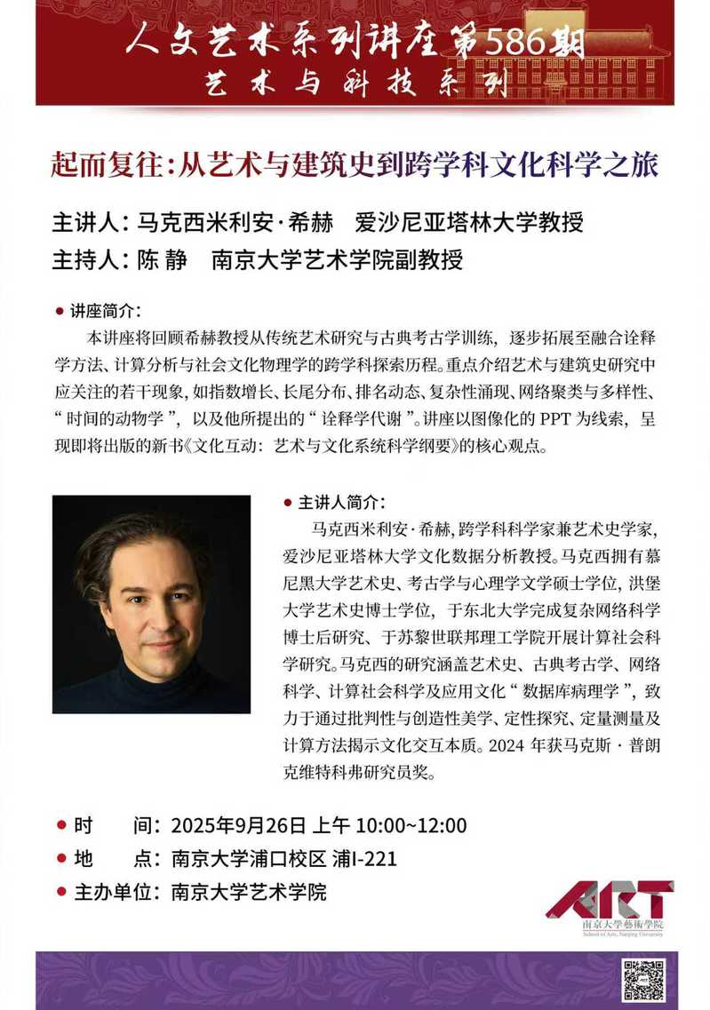 本讲座将回顾希赫教授从传统艺术研究与古典考古学训练,逐步拓展至融合诠释学方法、计算分析与社会文化物理学的跨学科探索历程。重点介绍艺术与建筑史研究中应关注的若干现象,如指数增长、长尾分布、排名动态、复杂性涌现、网络聚类与多样性、“时间的动物学”,以及他所提出的“诠释学代谢”。讲座以图像化的PPT为线索,呈现即将出版的新书《文化互动:艺术与文化系统科学纲要》的核心观点。