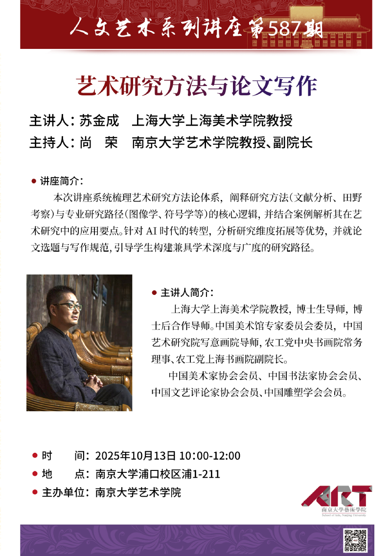 本次讲座系统梳理艺术研究方法论体系,阐释研究方法(文献分析、田野考察)与专业研究路径(图像学、符号学等)的核心逻辑,并结合案例解析其在艺术研究中的应用要点。针对AI时代的转型,分析研究维度拓展等优势,并就论文选题与写作规范,引导学生构建兼具学术深度与广度的研究路径。