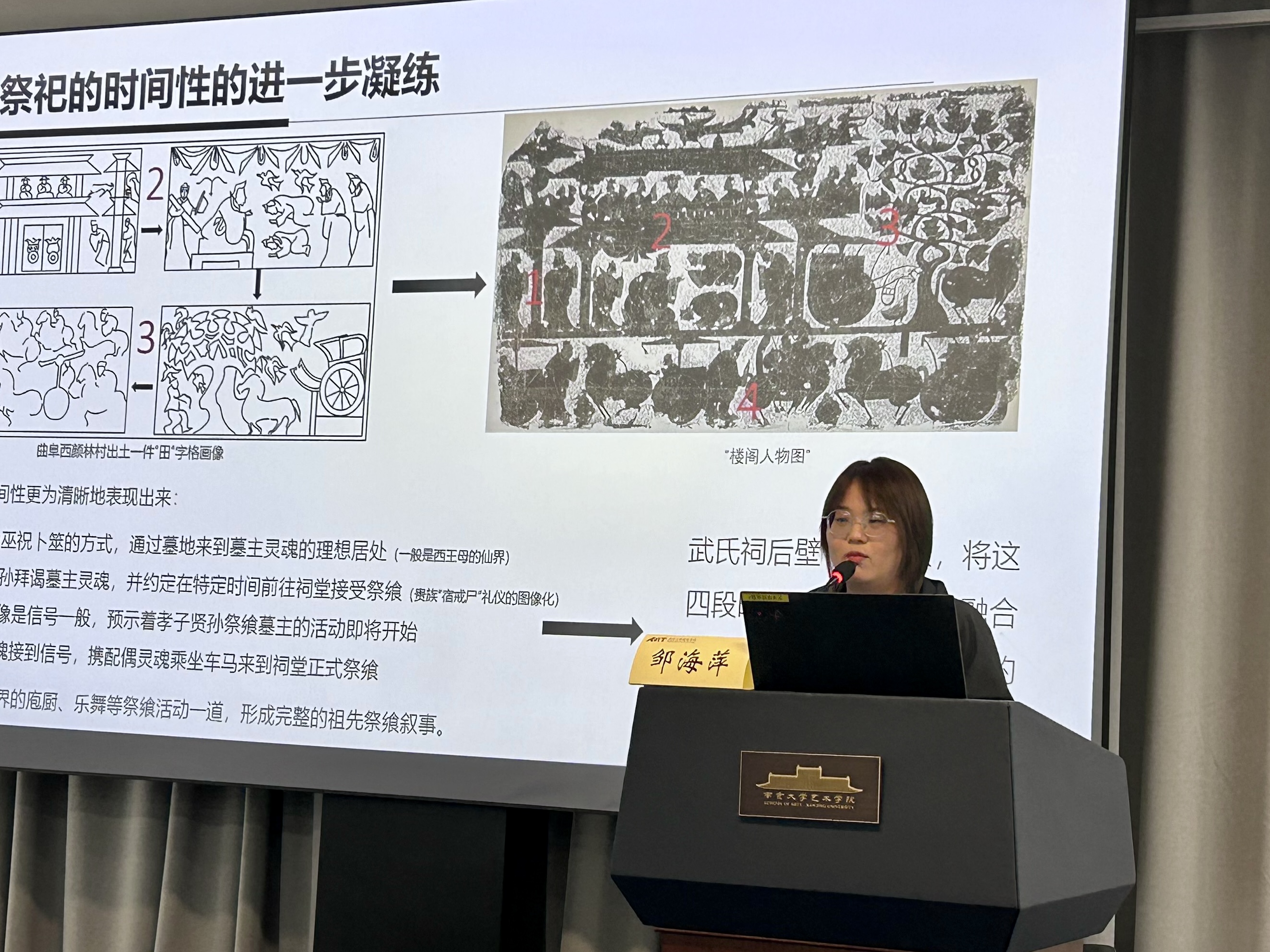 邹海萍以《行为展演到图像符号:从祖先祭祀礼仪看东汉石祠图像的两套叙事》为题,她表明东汉大石祠存在两套独立的图像叙事:上半部分意在实现对后世子孙的伦理教化,下半部分则成为祖先祭飨核心叙事的组成部分。