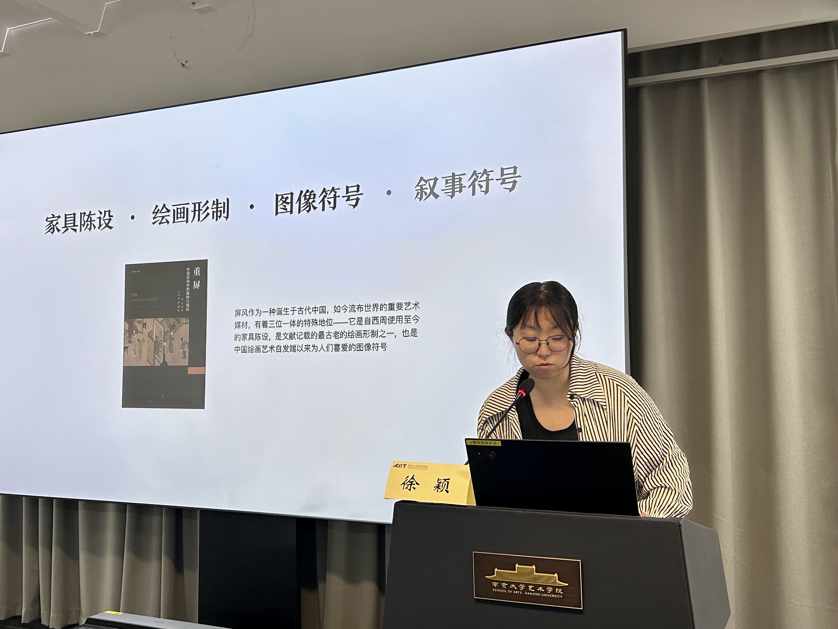 徐颖以《空间叙事理论视阈下“屏风”的叙事空间建构与当代转化》为题,通过探讨使用情境中的“意义空间”、古代叙事作品里的“叙事空间”以及现代舞台上的“戏剧空间”,以此强调屏风在空间建构与叙事表达上的独特作用。