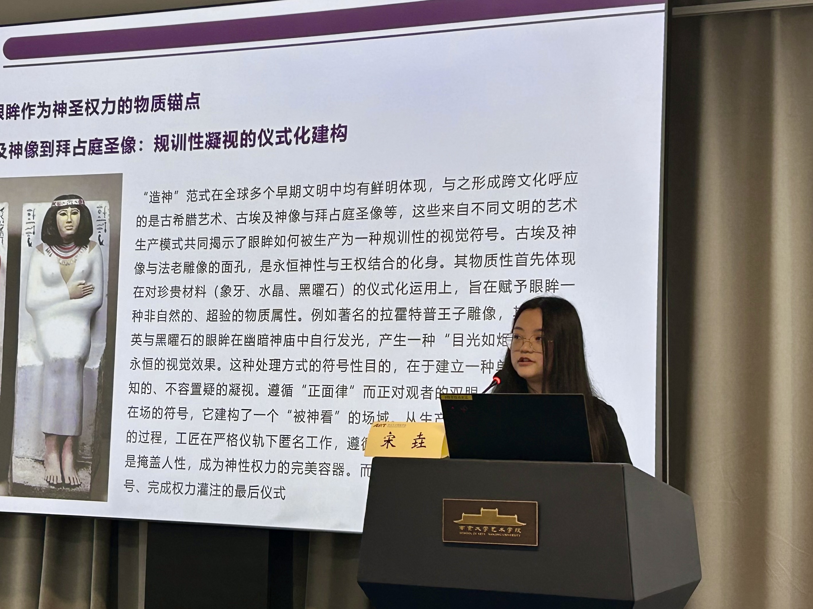宋垚以《造神、摹人与编码:眼眸符号如何参与面孔的艺术生产》为题,将上古至当代的“面孔”艺术生产凝练成“造神”“摹人”“编码”三大范式,进而梳理了面孔中的“眼眸”如何从神圣权力的物质锚点蜕变为内在精神的隐喻之窗,最终演化为数据与权力的交互界面的过程。