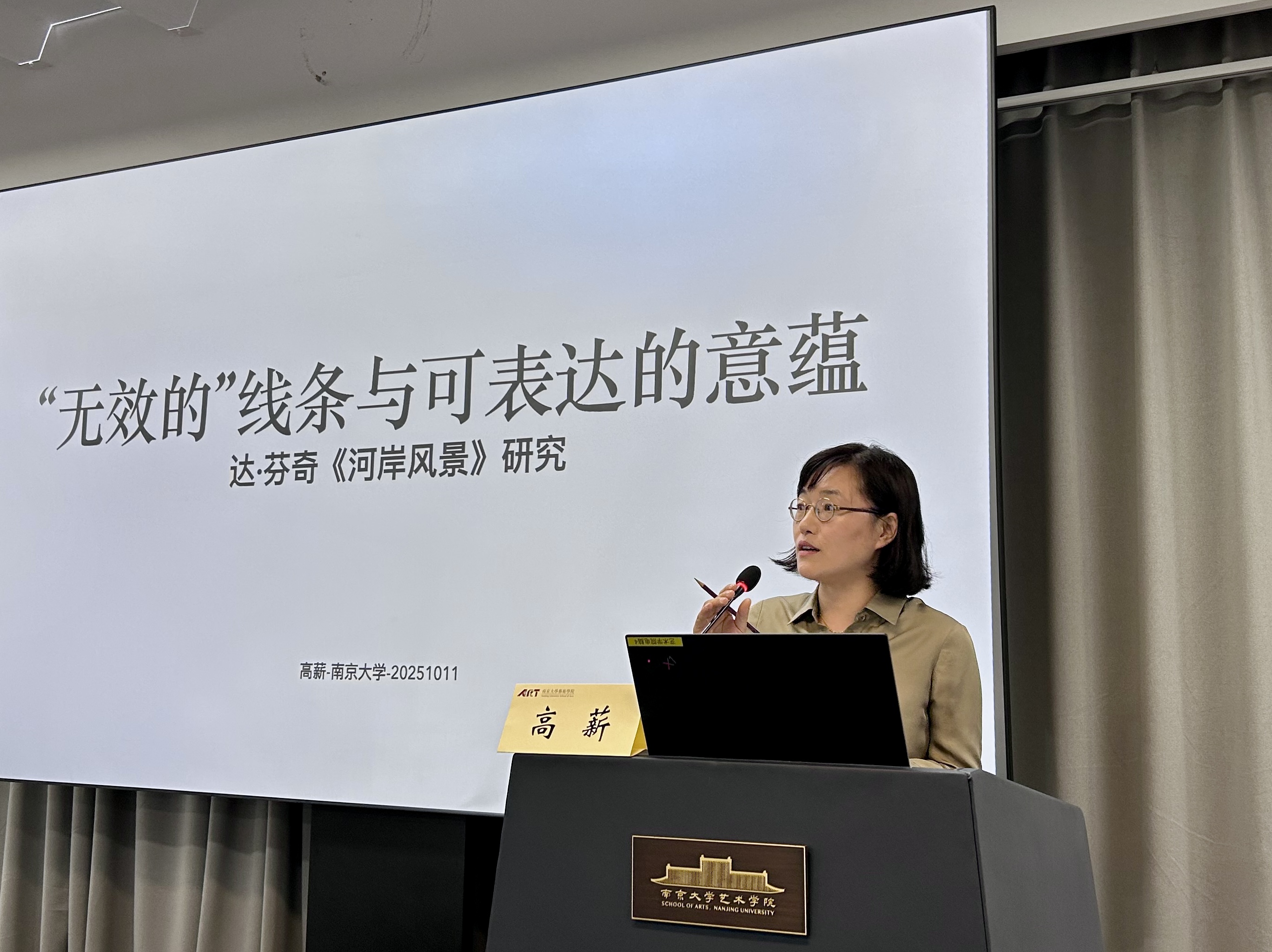 高薪副教授以《“⽆效的”线条与可表达的意蕴》为题,对列奥纳多·达·芬奇1473年的素描《河岸风景》进行了一次深刻的学术探索。她指出,这件作品作为达芬奇有记录的首幅独立创作,诞生于文艺复兴范式成熟的核心地带,却深刻地挑战了当时的主流观念,向世人展现了达芬奇作为一个“反人文主义者”的形象。她也表明,通过描绘水的多种形态及其对岩石的侵蚀作用,达芬奇的关注点已从装饰性背景转向了一种科学的研究。在这一观察过程中,达·芬奇洞察到一个远超阿尔贝蒂所倡导的“历史”(istoria)时间的、更为古老的“地质时间”。这一非历史的、近乎永恒的时间观念,成为了其后续作品(如《蒙娜丽莎》的背景)中超越性维度的来源,将神圣主题置于世俗时间之外。在认知层面,对水流连续性与无限复杂性的观察,使达芬奇意识到线条在捕捉现实上的局限性。这一知识学上的突破,直接促使达芬奇发明了“晕涂法”(sfumato),其目的不再是模仿自然之形态,而是效法自然之效果。最后,她总结道,这幅早期素描如一颗“种子”,不仅预示了艺术家一生的核心关切,更标志着绘画从人文主义叙事传统中独立出来,成为一种具有独立认知效力的现代媒介。