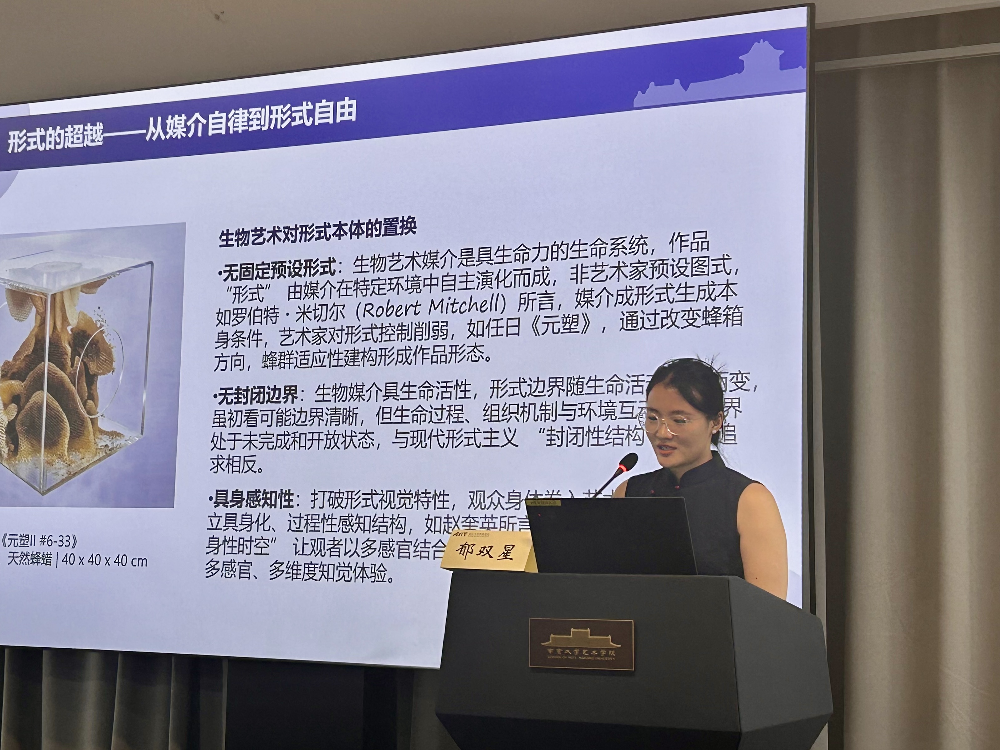 郁双星以《生物艺术媒介的三重超越:对艺术本体的重构路径》为题,表明生物艺术媒介从被动材料走向自创生性媒介、从形式的自律走向形式的自由、从对象性的物性走向具有主体性的主体的过程,推动了当代艺术媒介的生成和本体的重构。
