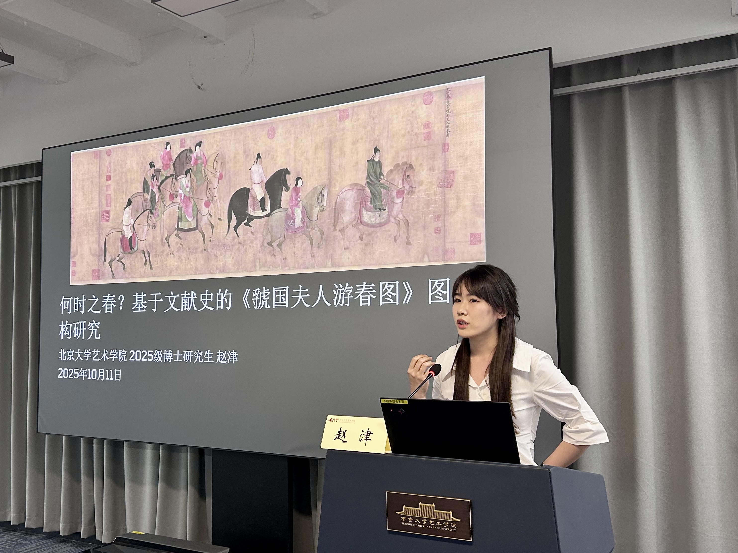赵津以《何时之春?基于文献史的〈虢国夫人游春图〉流传重构史研究》为题,探讨了《虢国夫人游春图》在历史传承中可能经历的图像重构与概念生成现象,并试图揭示中国古代绘画史书写中文本与图像交互建构的内在机制。