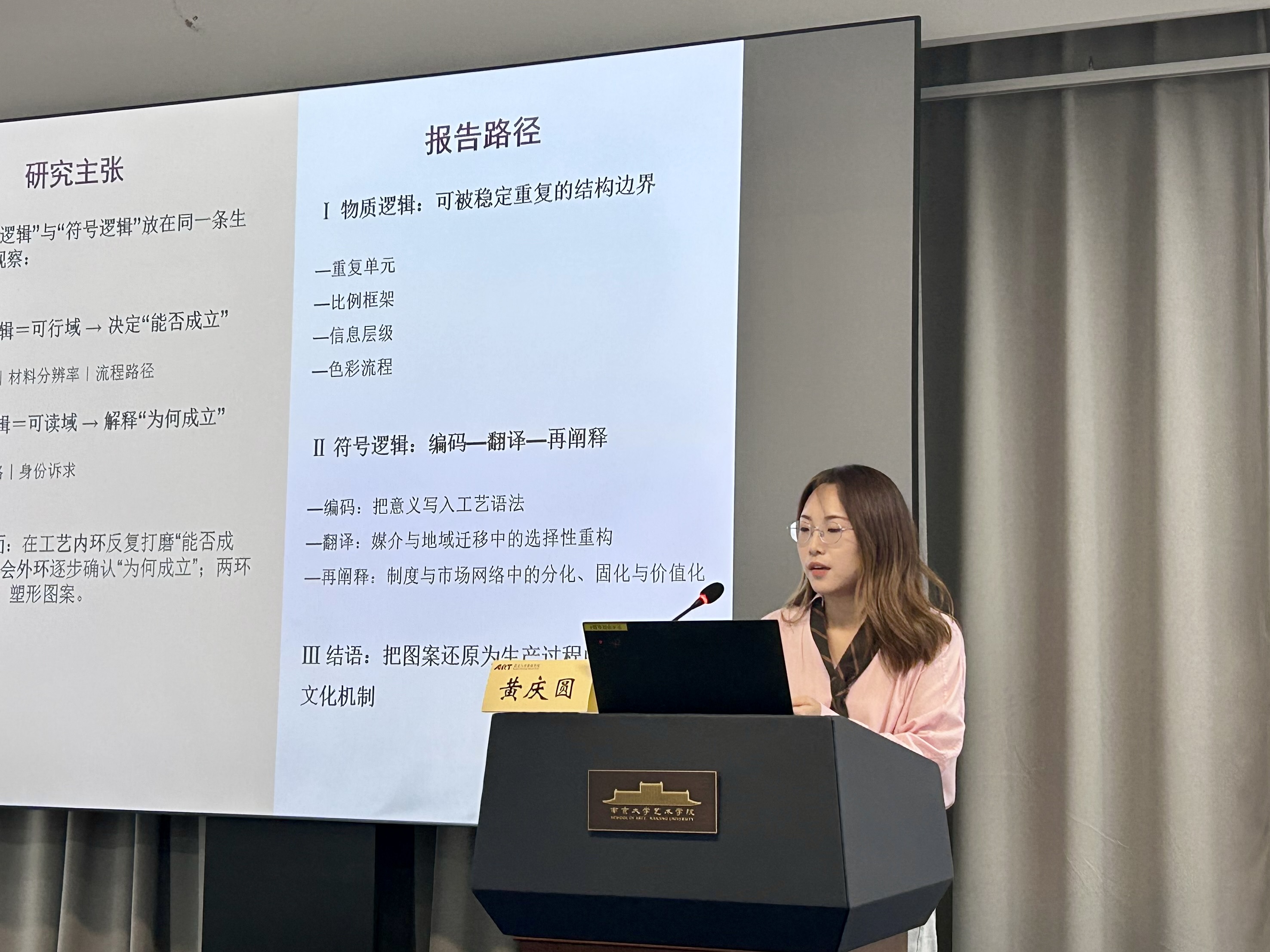黄庆圆以《物质与符号之间:近代工艺语境下图案生成机制的再考察》为题,通过研究十八至十九世纪纺织与印花的核心案例,试图证明图案并非纯粹的形式或单纯的意义容器,而是物质与符号相互作用的产物、一种在生产过程中动态生成的文化机制。