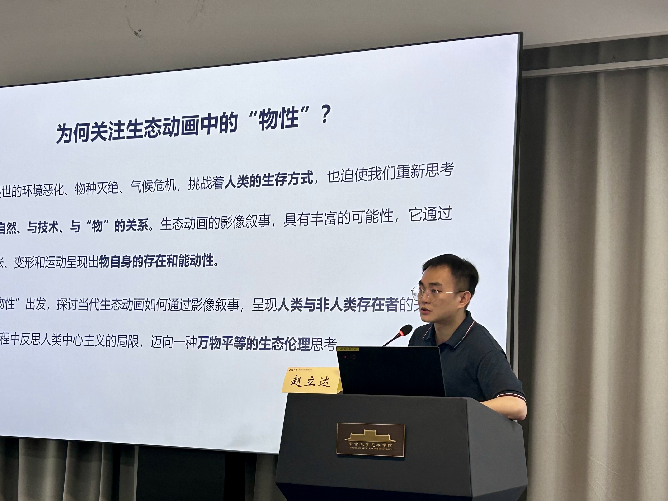 赵立达以《论当代生态动画叙事中的物性》为题,通过探讨生态动画叙事中物性呈现的三个层次,即从符号的物、行动的物到本体的物,试图证明其中物性观念从人类中心主义向万物于存在意义上平等的转变。