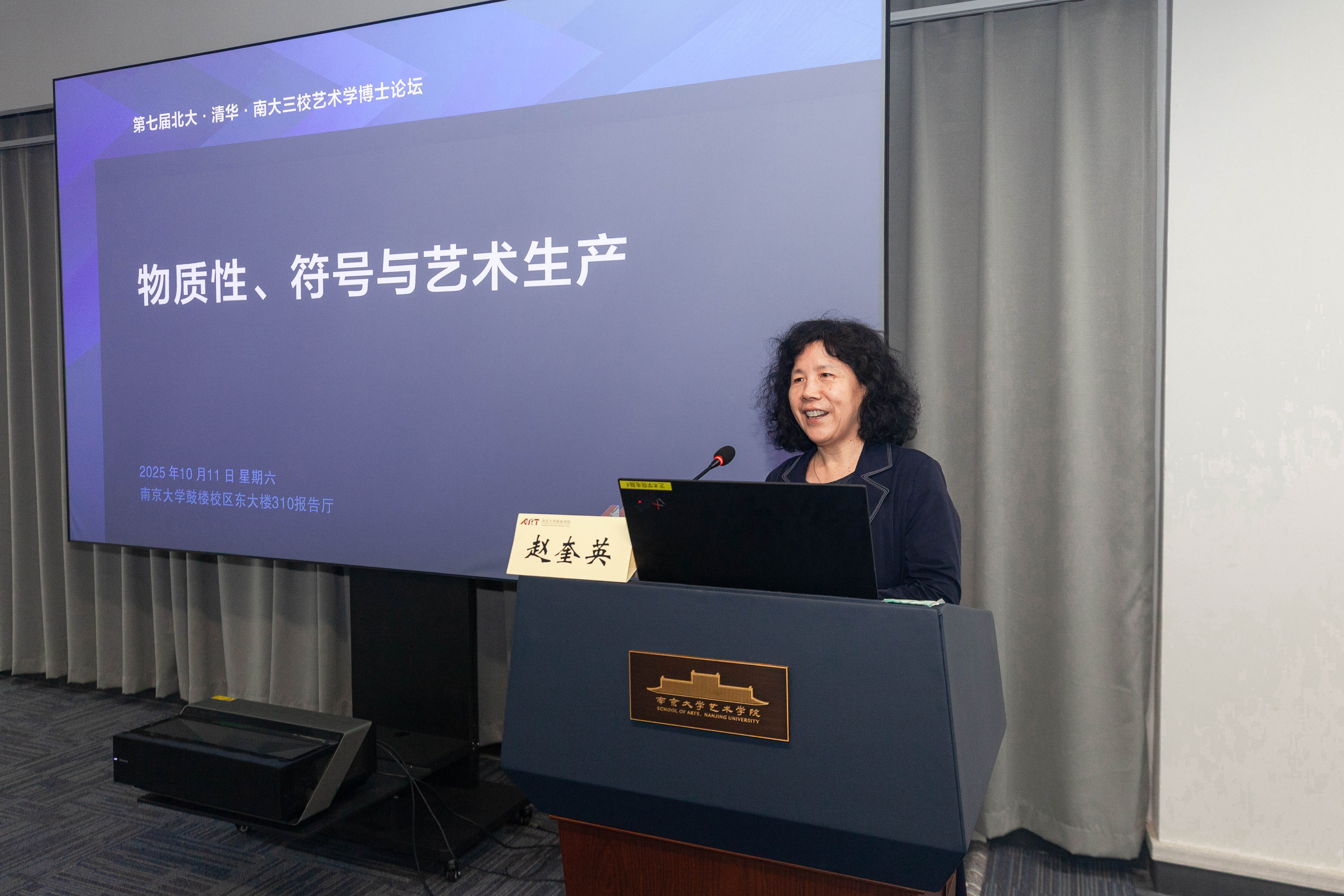 赵奎英教授代表桃花坞 对与会师生表示热烈欢迎,并对论坛组织团队致谢。她指出,本届论坛主题“物质性、符号与艺术生产”紧扣学科前沿,涉及艺术本体存在的核心议题,在“去物质化”与“符号化”交织的当代语境中尤具探讨价值。她期待与会博士生在交流中激发思想、深化友谊,共同推动艺术学研究的进步。