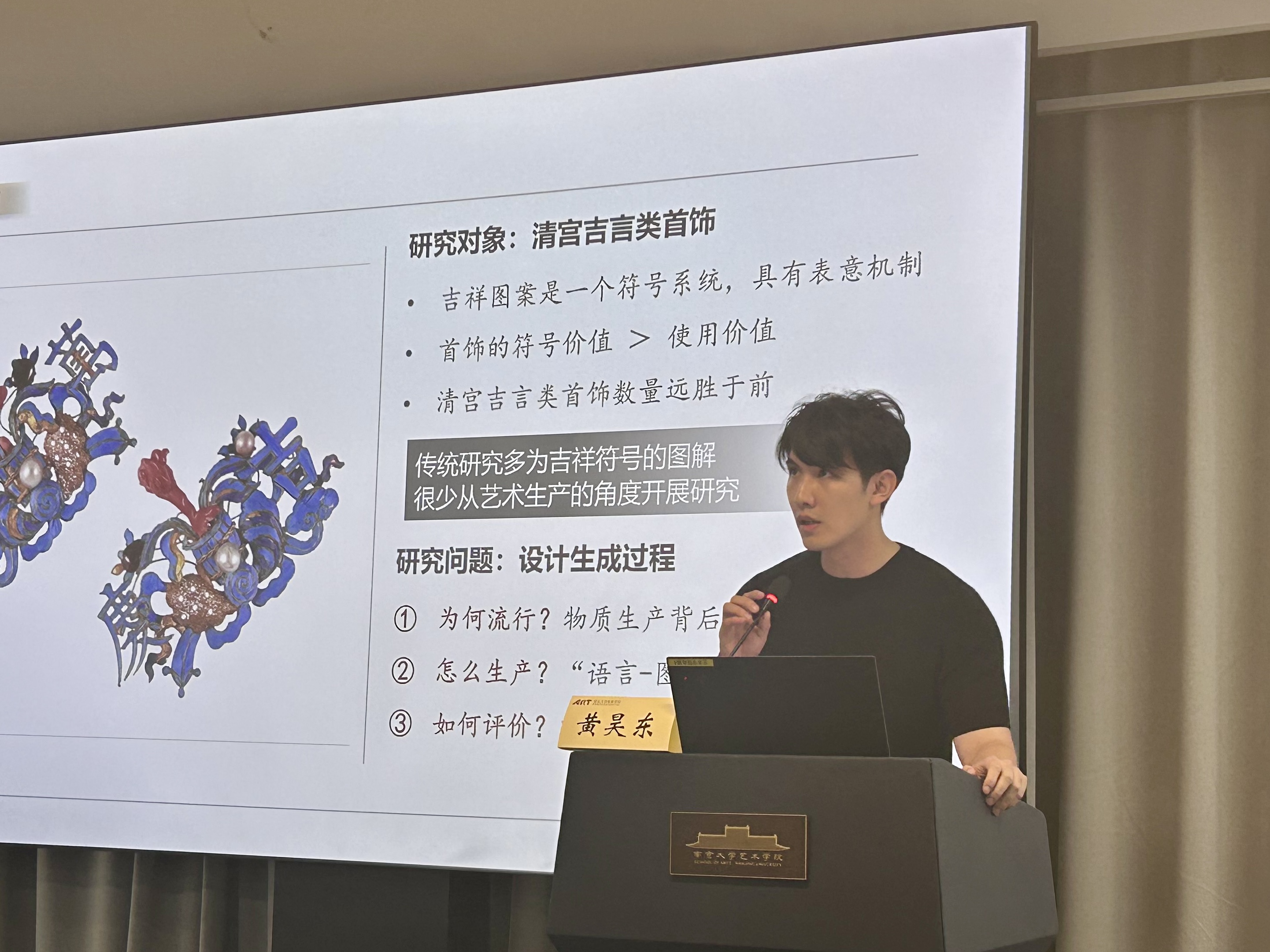 黄昊东以《吉言祝语到物质生产:清宫吉言类首饰的设计生成研究》为题,深入剖析了清宫吉言类首饰从“祝语”到“物质”的设计生成过程,并指明此种艺术生产本质上是一种高度组织化的“文化编码”实践。