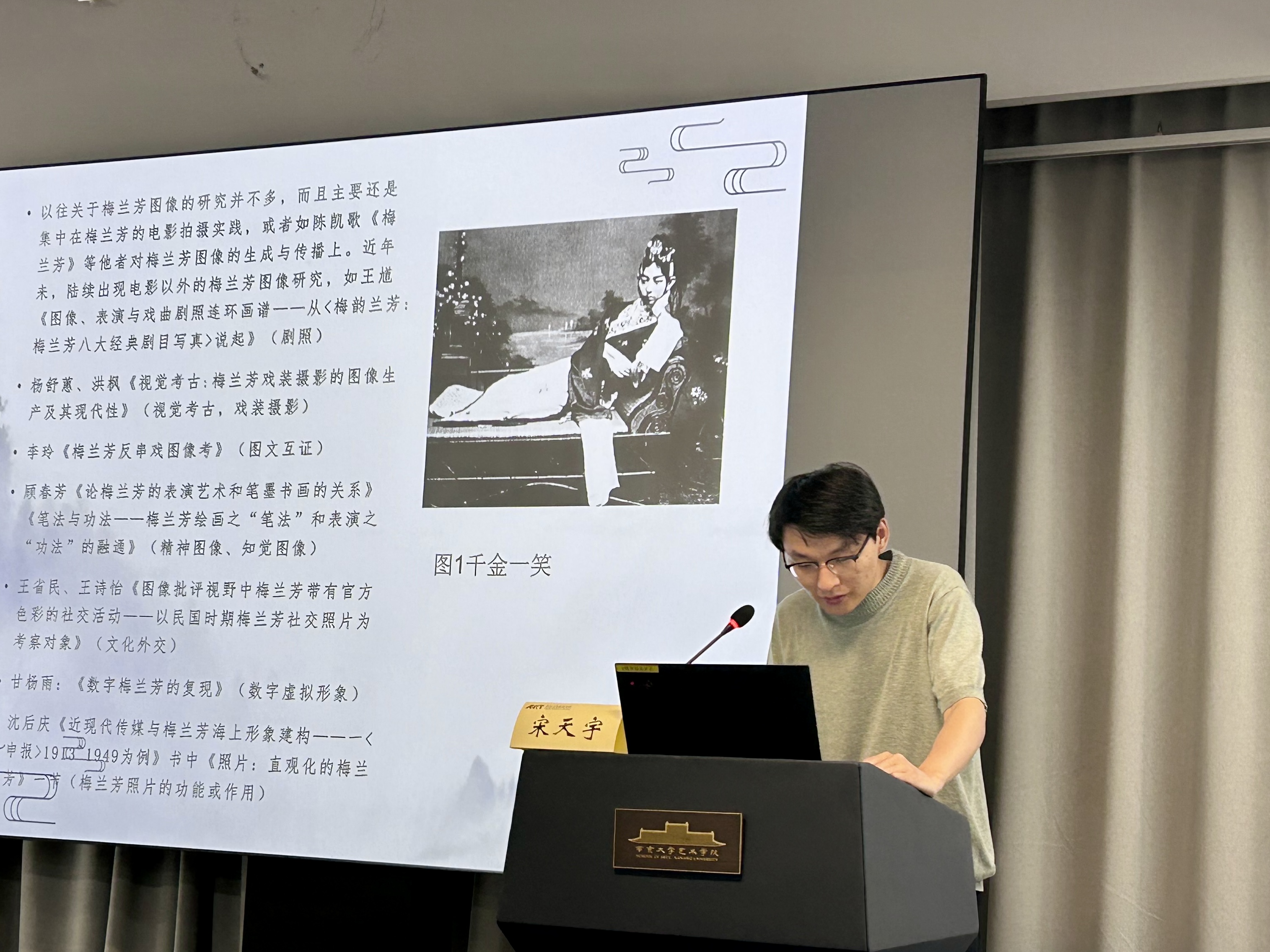 宋天宇以《抗战时期(1931-1945)梅兰芳图像的生成与传播作用新探》为题,通过重审抗战时期梅兰芳图像的生成与传播,指出了梅兰芳图像具有的商业与救亡教育功能,凸显了其中的图像—媒介本体意义。