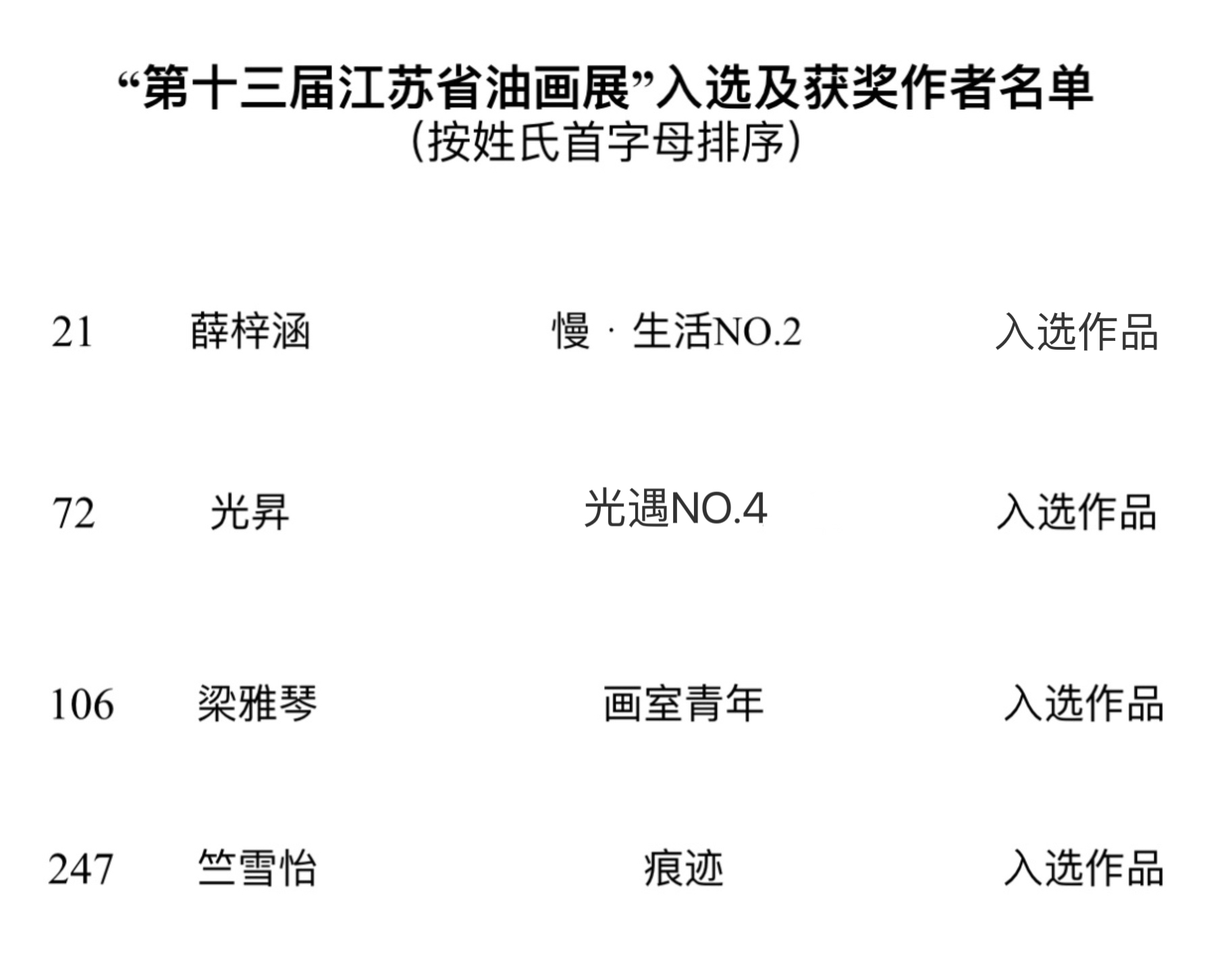 在此背景下,桃花坞 学子以高度的热情与卓越的才华,积极响应号召,创作出了一系列令人瞩目的优秀作品,在“中美协—悲鸿风度第二届油画双年展”、“江苏省第二届书法临帖作品展”、“江苏省第十三届油画展”多个重量级展览中大放异彩,取得了令人骄傲的成绩。具体名单如下。