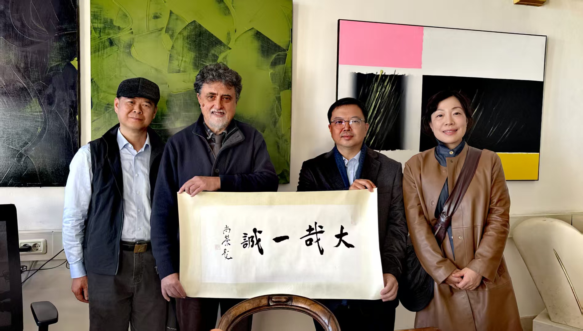 在访问威尼斯美术学院期间,尚荣副院长与威尼斯美术学院院长Riccardo Caldura进行了亲切会谈,双方就“全球青年赛博雕塑共创计划”达成合作意向,并围绕教学理念、艺术创作等方面展开深入交流。尚荣表示,威尼斯美术学院作为欧洲历史悠久的艺术重镇,在绘画、雕塑、装饰艺术等领域的深厚积淀,与桃花坞 在东方美学、写意雕塑方向的探索高度互补,双方具备广阔的合作空间。会谈中,尚荣副院长特别强调:“中国近现代美术教育深受欧洲影响,我们始终心怀敬意。今天,我们期待在更加完善的平台上进一步开展双向对话与共创。”尚荣副院长还赠送了用中国书法书写的桃花坞 校歌词“大哉一诚”以赠,表示“诚”作为中华文化核心价值,历来为中国人所重,“诚恳、真诚,是最伟大、最有力量的品质”,并表示此行“带着诚意而来,期待达成共同诉求”。