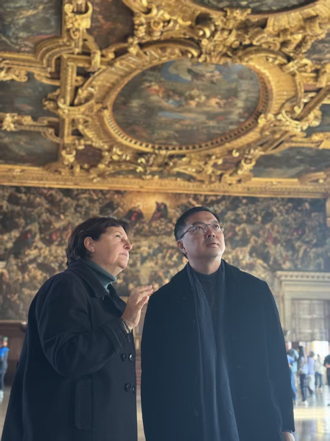 (威尼斯市立博物馆馆长Chiara Squarcina向尚荣副院长介绍大会议厅所陈列展示的文化)