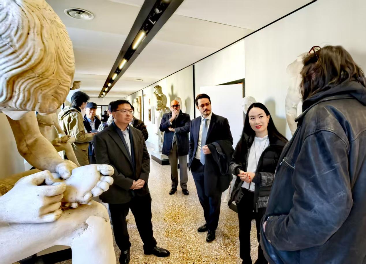 代表团随后参观了威尼斯美术学院雕塑教研室、版画工作室等教学空间,与师生就创作方法与课程设置进行交流,并合影留念。双方初步达成意向,未来将进一步探讨合作机制。