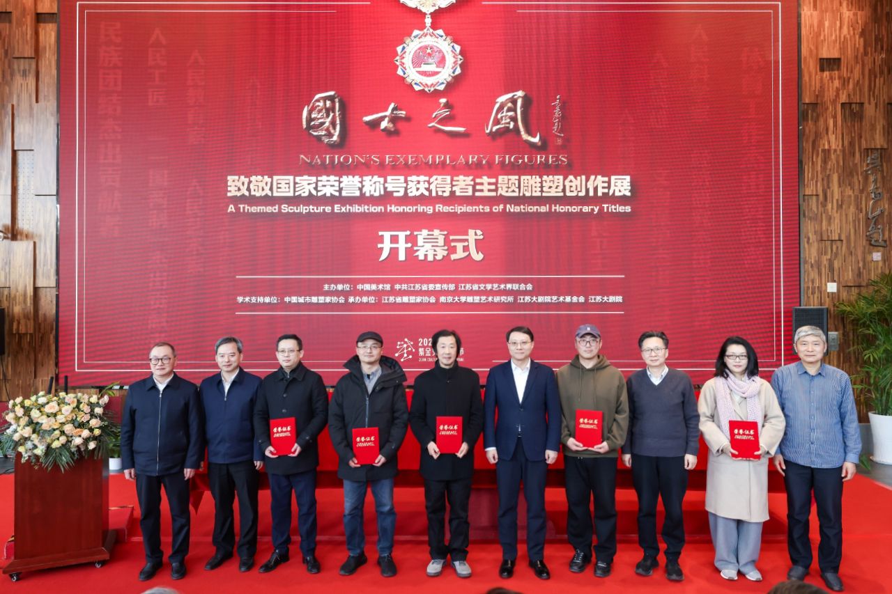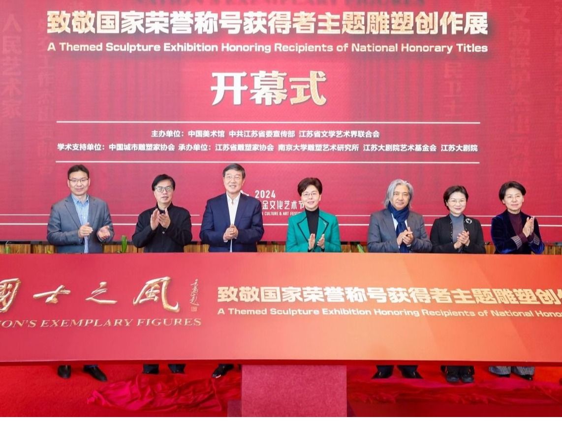 12月30日下午,2024“国士之风”致敬国家荣称号获得者主题雕塑创作展在江苏大剧院美术馆开幕。省委常委、宣传部部长徐缨,全国政协副秘书长、民盟中央专职副主席、中国美术馆馆长吴为山,江苏省政协副主席、党组成员姚晓东,江苏省委宣传部副部长徐宁,江苏省文联主席章剑华,江苏省文联党组书记、副主席、书记处第一书记常胜梅,江苏省文化投资管理集团有限公司党委书记、董事长、总经理叶飚荣出席开幕式并为展览揭幕。吴为山、徐宁、章剑华分别发表讲话。桃花坞 党委副书记陈云松出席开幕式并为参展代表颁发证书。