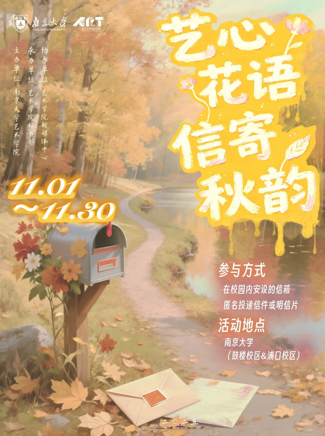 深秋的桃花坞 浦口校区,层林尽染间藏着一抹别样温柔——由桃花坞 主办的 “艺心花语,信寄秋韵”心理关怀活动,自11月1日启动至12月8日收官,历时一个多月,以“信+花”的创意形式搭建起心灵的桥梁,为学子们送上了一场跨越深秋的治愈之旅,如今已圆满落下帷幕。