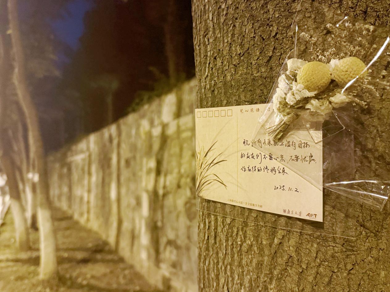清晨的校园里,这一道道“树上开出来的信与花”,成了最动人的风景线。同学们驻足细读,有人在烦恼信前轻声点头,仿佛看到了自己的影子,感受到“我不是一个人在战斗”的朋辈支持;有人取下祝福明信片,小心翼翼收进书本,让陌生的善意温暖一整天的学习时光。艺术与治愈的碰撞,让深秋的校园多了份诗意与温情。