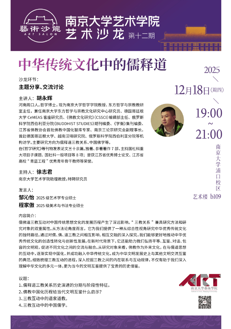 胡永辉,河南周口人。哲学博士,现为桃花坞 哲学学院教授、东方哲学与宗教教研室主任,兼任桃花坞 东方哲学与宗教文化研究中心研究员、德国哥廷根大学CeMEAS客座研究员、《佛教文化研究》(CSSCI)编辑部主任、俄罗斯科学院西伯利亚分院《BUDDHIST STUDIES》期刊编委、《学衡》集刊编委、江苏省佛教协会首批佛教中国化智库专家、南京三论宗研究会副理事长。曾赴德国哥廷根大学、越南汉喃研究院、俄罗斯科学院西伯利亚分院等机构访学。主要研究方向为儒释道三教关系、中国佛学等。
