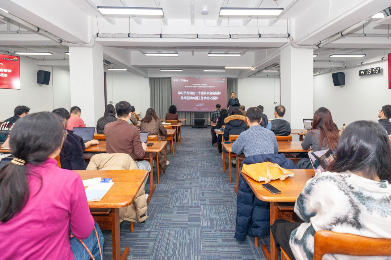 12月17日下午,南桃花坞 党委常委、党委宣传部部长、党委统战部部长闻羽为专题培训班学员主讲《学习贯彻党的二十届四中全会精神,推动国际传播工作系统化进阶》。他聚焦党的二十届四中全会与“十五五”规划的核心要求,深入阐释了国际传播在国家现代化进程中的战略意义。通过梳理习近平总书记对国际传播工作的重要论述和指示要求,他着重阐释了完善国际传播体制机制、创新国际传播载体和方式的重要性,并表示桃花坞 正积极响应“十五五”规划的要求,立足学科优势,在提升国际话语权、讲好中国故事、推动文明交流互鉴等领域主动作为。他重点分享了桃花坞 在国际传播活动中的实践探索与阶段性成果,通过丰富案例展现了桃花坞 国际传播工作的多维布局,介绍了学校国际传播工作的三大核心方向和三条应对策略,指导师生党员充分发挥学科优势,通过目标升华、渠道拓展、平台创新等举措,开展具有国际影响力的艺术理论研究和富于深切感染力的艺术创作实践,用学术力量、艺术表达、青春视角向世界讲好中国故事与南大故事,共同推进桃花坞 国际传播工作系统化进阶。