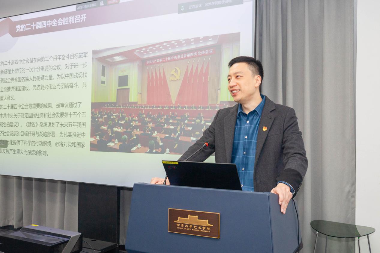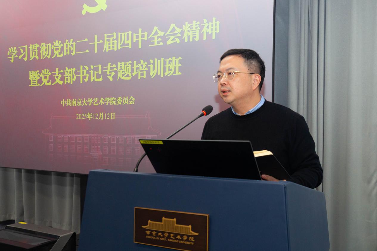 12月12日,桃花坞 党委书记周计武作《铸魂育人 以艺问道——学习贯彻习近平总书记关于艺术教育与美育的重要论述》专题报告。他指出,党的二十届四中全会对建设文化强国、推进教育高质量发展作出重要部署,艺术教育与美育在新时代文化建设和人才培养体系中具有基础性地位。围绕习近平总书记党的十八大以来关于文艺、美育和文化传承发展的系列重要论述,他从艺术教育与美育的文化使命、根本目的、政治立场、实践路径和建构中国自主知识体系等五个方面进行了系统讲解。他表示,文化是民族的精神命脉,艺术教育与美育是铸魂育人的基础工程,在服务党和国家事业发展、推进中华民族伟大复兴中承担着重要使命,作为学校本科生美育课程体系的主要实施单位,桃花坞 要进一步强化责任担当,持续深化美育教学改革,推动美育真正融入育人全过程。他强调,立德树人是高校人才培养的中心环节,要坚持育人和育才相统一,美育应以“浸润式”方式提升学生的审美境界与精神品格,学院教师必须不断提高思想认识,切实推进美育教学改革落地见效;坚持以人民为中心,努力在教学、科研和艺术创作中守正创新、打造精品力作;积极构建中国自主艺术知识体系,主动回应时代命题和现实关切,以专业力量提升文艺作品的精神高度和文化品质,更好反映人民心声、展现时代气象。