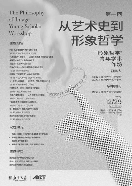 2024年,为了拓展该研究领域与相关话题在青年学者中的延伸,在桃花坞 人文社会科学高级研究院的支持下,桃花坞 召集来自全国不同高校和学术单位的10位青年学者召开了“形象哲学”青年工作坊。作为一项长期计划,青年工作坊的第一期将论题聚焦于“从艺术史到形象哲学”。艺术史是形象及图像研究的老牌学科,从19世纪以来已经积累了从图像学(Iconography)、形式分析、符号学、语境论、图像人类学、图像行为理论等在内的诸多方法,并且随着上世纪70年代以来“新艺术史”实践的拓展,形象或图像逐渐成为能够链接更广泛社会历史境况的存在物。另一方面,对图像的关注本身也促进了这个学科的开放,从而能够与思想史和文化史等领域相映照。从艺术史到形象/图像哲学的学术转变,在理论上想要突破对艺术性问题的独一关照,从更广泛的哲学视阈考察形象性的存在。何谓形象?形象如何存在?艺术史上形象的变迁如何反应社会和文化的变迁?我们如何讲述形象-历史?形象又是如何影响我们的审美和认知、文化记忆和权力关系的?这一系列问题不仅关乎艺术的本质,也与哲学中关于存在与表征的议题息息相关。“形象哲学青年工作坊”的第一回以“从艺术史到形象哲学”为专题,除了探索形象与世界,形象与媒介,以及形象与想象和记忆之间的关系外,还试图揭示艺术史为形象哲学所提供的思想资源,以及形象哲学反向对艺术史学术视野的拓展。