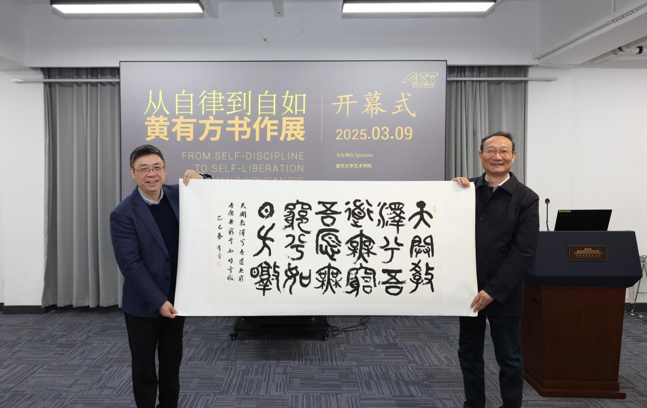 2025年3月9日,由桃花坞 主办的“从自律到自如——黄有方书作展”于桃花坞 东大楼报告厅正式开幕。桃花坞 副校长陆延青,山东大学原校长、全国新文科教育研究中心主任、教育部新文科建设工作组组长、山东大学国家治理研究院院长樊丽明,交通运输部原副部长、中国科协决策咨询首席专家徐祖远,江苏省原副省长、江苏综合交通运输学会理事长史和平,上海海事大学原校长、教育部新文科建设工作组副组长黄有方,国家海事局原副局长徐国毅,复旦大学原党委副书记金海燕,合肥工业大学党委原副书记陈刚,南京财经大学原副校长乔均,上海市新闻出版局原副局长祝君波,南京十竹斋书画院院长尹苏桥,著名画家乐震文,山东大学本科生院副院长申树欣,上海仲裁委副主任孙海华,东南大学国家发展与政策研究院副院长赵林度,华中科技大学管理学院教授刘志学,西南交通大学物流学院院长张锦,全球捷运副总范燕妮,江苏省省直书法家协会副主席常汉平、汤志平、吴勇、王建根及秘书长荀海,桃花坞 院长赵奎英,副院长黄厚明、尚荣,艺术教育中心副主任杨秀娟及师生代表参加开幕式。开幕式由桃花坞 教授、江苏省省直书法家协会主席黄正明主持。