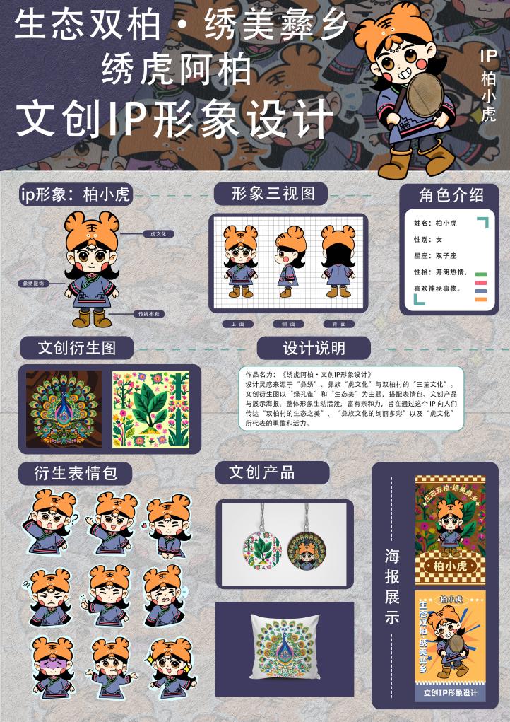 团队以云南省双柏村生态环境与彝族传统文化为依托,收集整理双柏村历史文献,收集生态数据,调研生态保护方案;结合现代设计理念,创新刺绣产品样式,开发出兼具实用与艺术价值的文创产品。不同专业背景成员在实践中相互协作,发挥各自优势,讲述彝族刺绣背后故事,挖掘文化内涵。收集拍摄彝族刺绣作品、制作过程等资料,建立文化档案。最终形成一款IP形象,2套文创设计作品,1份实践报告,1份实践总结,4份实践日志和若干调研资料图集。