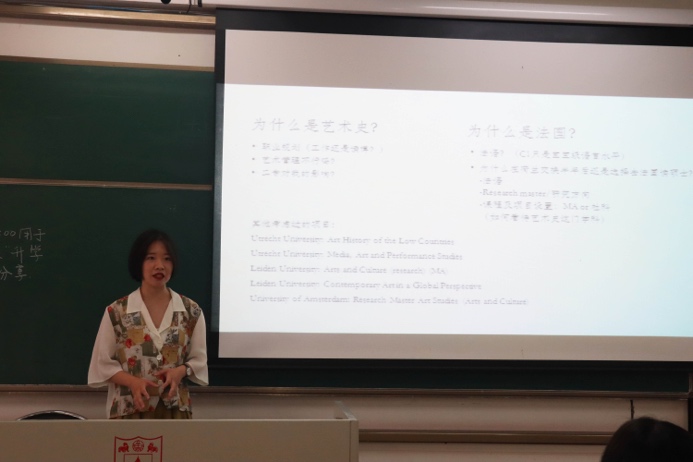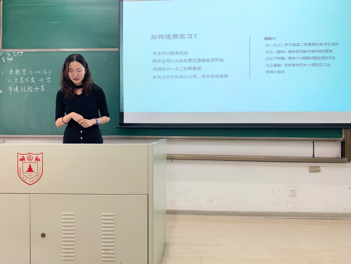 来自文学院的屈伸即将前往纽约大学美术研究所进行艺术史硕士的学习,她分享了大学四年和教授间愉快相处的经历,并且分享了她通过在UC Berkeley一学期的交换如何收获了教授的推荐信。在分享过程中,她强调了多尝试不同实习、多选课、多与教授交流的重要性,也强调了尽早做好大学时期学习生活规划的重要性。同时,她也欢迎越来越多有志于艺术史学习的同学能够加入桃花坞 的二专学习,在她看来,这能让同学们少走很多弯路。