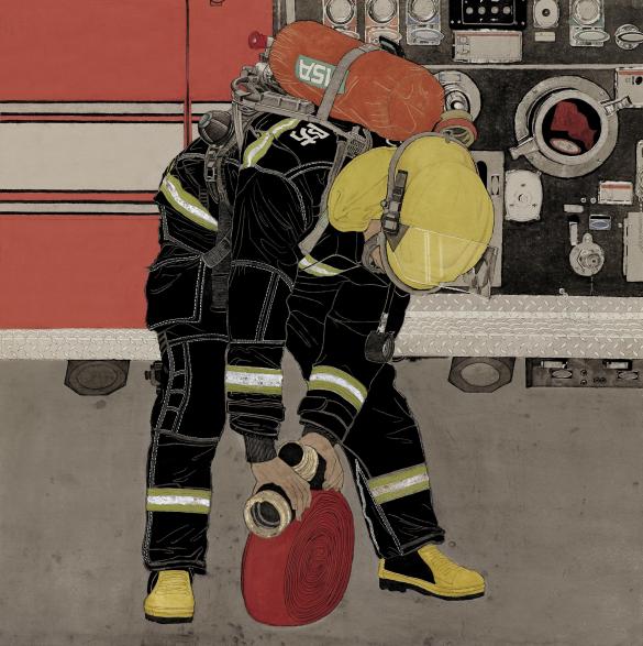 消防队伍是我们和平年代牺牲奉献最多的队伍,涌现出了很多先进的集体和英雄人物,是一支值得弘扬和讴歌的队伍。消防救援队伍对党忠诚、一心为民、英勇顽强、舍生忘死、可亲可敬的精神风貌和为民情怀,因此我创作了一批描绘消防员的艺术作品。我曾经因拍摄过一部分消防员训练的场景,从而选择了消防题材这个题材进行艺术创作,这件作品描绘的是一位消防员弯腰练习消防动作的一个场景,期望通过对正在训练的消防队员的描绘让更多观众了解真实的消防员。