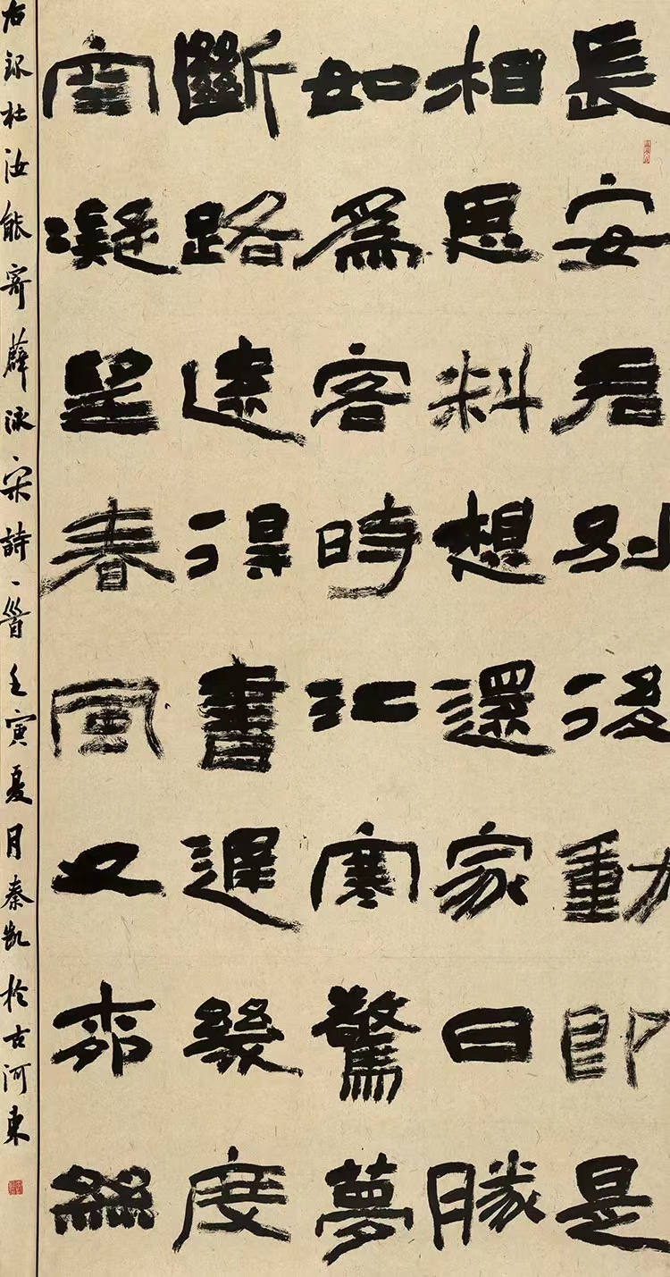 此件作品以汉代隶书《石门颂》为取法对象,追求汉代摩崖石刻古典厚重的面貌。在创作过程中,在用笔上以绞转笔法为主,结字上保留了《石门颂》苍劲灵动的特点,力求表现隶书作品的“正大气象”。