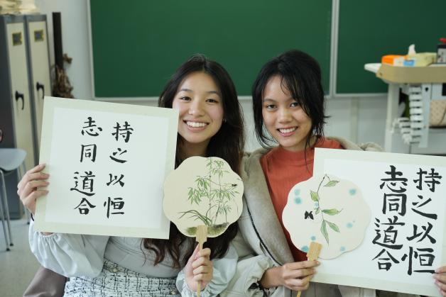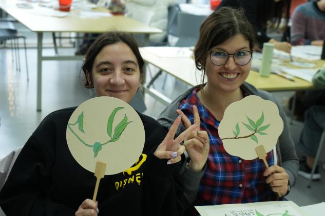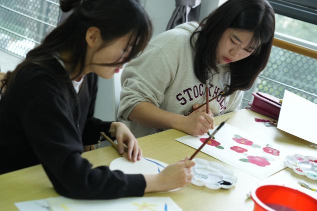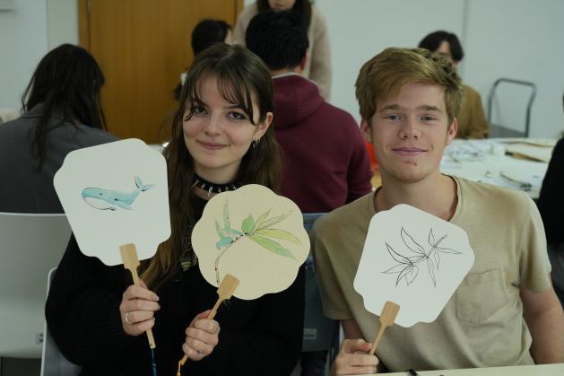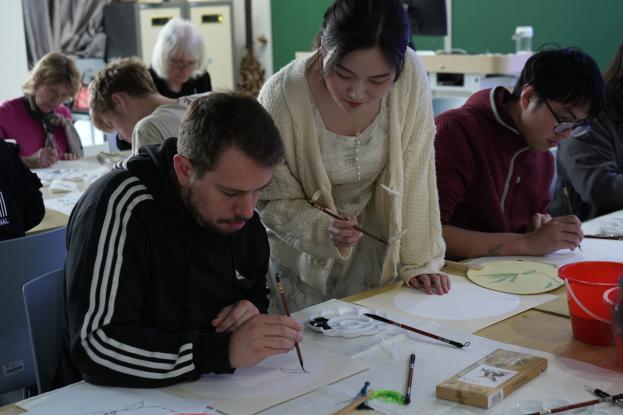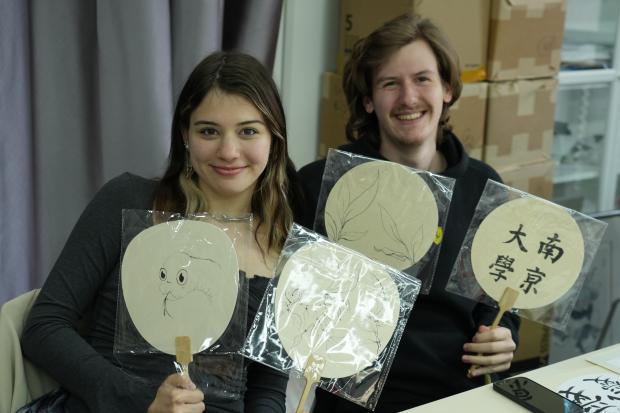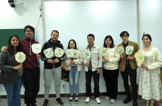 随后的实践体验环节更是让外籍师生们感受到了中华传统书画艺术的魅力。在桃花坞 同学们的辅导下,他们拿起毛笔,尝试在宣纸和扇面上书写和绘画,他们有人尝试临摹新学的竹叶,有人写下了“桃花坞 ”“我爱中国”的字样,还有人发挥丰富的想象力自行创作,并在作品上题上了自己的中文名。