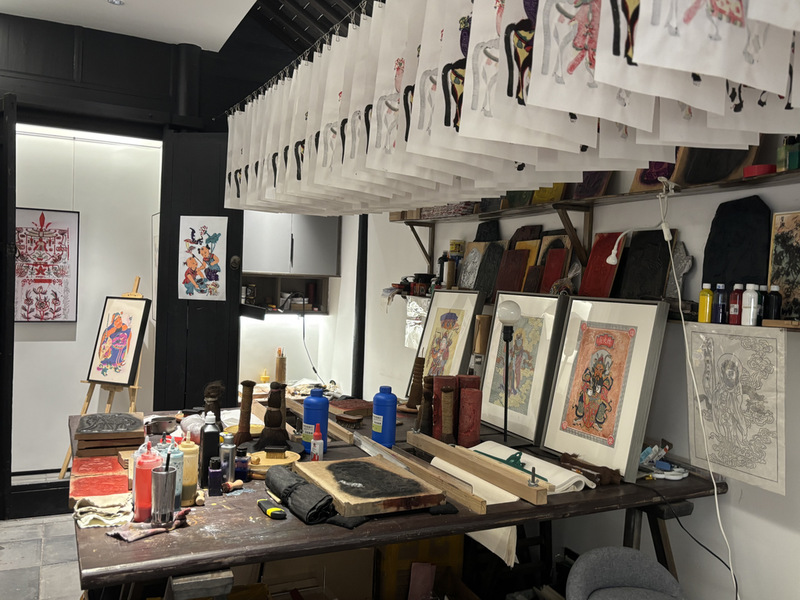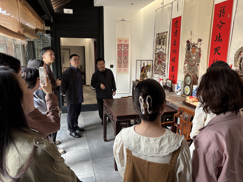在南通的行程中,还少不了校友的一路相伴和关心照顾。11日上午,在杨红卫老师的热情邀请下,团队走进了“年画小院”,开启一场别具风格的文化之旅。古往今来,“年画”二字仿佛天生便带着鲜亮的色泽,深深镌刻在人们的关于“辞旧迎新”“阖家团聚”的记忆深处。展馆中,来自不同时代的年画齐聚一堂,为小院增添了浓浓的年味与情味。在杨老师的讲解下,大家不仅领略了年画的视觉之美,更了解到其背后所蕴藏的地域文化底蕴与民间手工艺人的匠心传承。在交流与探讨中,杨老师不仅表达了对年画事业的热爱与坚守,使师生们深切感受到一位民间艺术家坚守初心、默默奉献的执着;还亲切地让同学们称他“师兄”,这份亲和与热忱,也如年画般传递着温暖与希望。“年画小院”庭中牡丹盛放,布置简雅又不失韵味,在阳光斜洒的屋檐下,老师与同学们留下了温馨的合影。