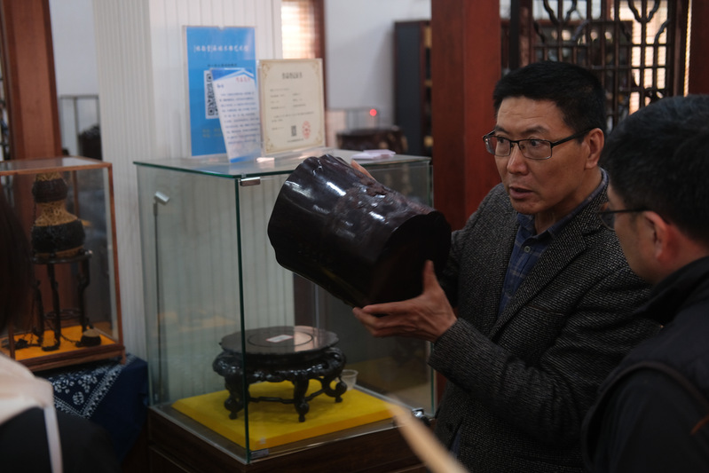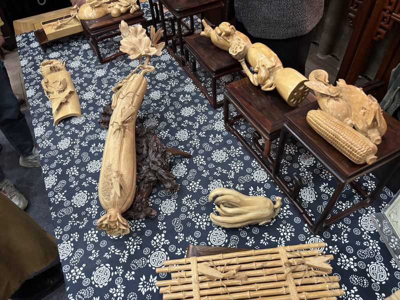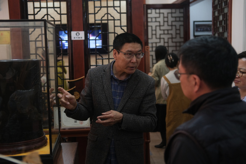 12日下午,师生团队探访林韵堂南通承林木雕艺术馆,开启了一场“以木载道”的非遗寻根之旅。作为江苏省工艺美术大师、南通红木雕刻非遗传承人,刘承林还有一重特殊身份——江苏艺术基金2024年度工艺美术高端人才高级研修班学员。这座由他亲手打造的艺术馆,不仅陈列着《福从天降》《心心相印》等恢宏大气的木雕代表作,更处处可见田园精神与传统工艺的深度交融。步入展馆,榫卯结构的明清式建筑与当代艺术展陈相映成趣。在刘承林老师的导览中,师生们惊叹于南通红木雕刻“精微透巧”的技艺特质,浮雕、圆雕、透雕技法在方寸间交织。特别引人注目的是田园系列作品,其聚焦于蝴蝶、蝉、蝈蝈、螳螂、知了、玉米、瓜果等寻常物件,通过精雕成为一件件和谐雅趣的田园作品。从选料时的木性感知,到运刀时的力度把控,看似简单的直线刻痕背后,是数十年的经验积淀。刘承林老师坦言,凡用心之作,皆有灵性。人生的价值在于对社会的贡献与留给后人的精神文化遗产,红木雕刻艺术的传承和发展更需要弘扬工匠精神。