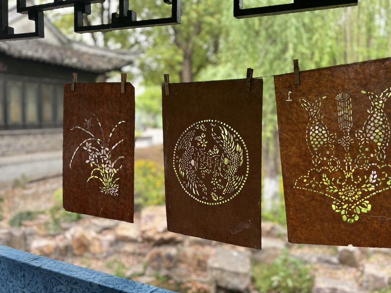 11日下午,团队走进南通蓝印花布博物馆,这座国内首家以蓝印花布为主题的专题馆,藏有明清以来的珍贵实物与工具。在国家级非遗传承人、中国工艺美术大师吴元新老师的导览中,师生们系统认知了蓝印花布刻版、刮浆、染色、刮白四大核心工艺,深刻领悟到“以刀代笔”的雕刻智慧与“以糊作墨”的防染精髓。纹样作为蓝印花布的灵魂,从梅兰竹菊的文人风骨到十二生肖的民俗意趣,从祥云瑞兽到江海浪纹,每处图样都诠释着“图必有意,意必吉祥”的东方美学密码,更通过“蓝底白花”的视觉语言,展现着江海文化中海纳百川的精神特质。