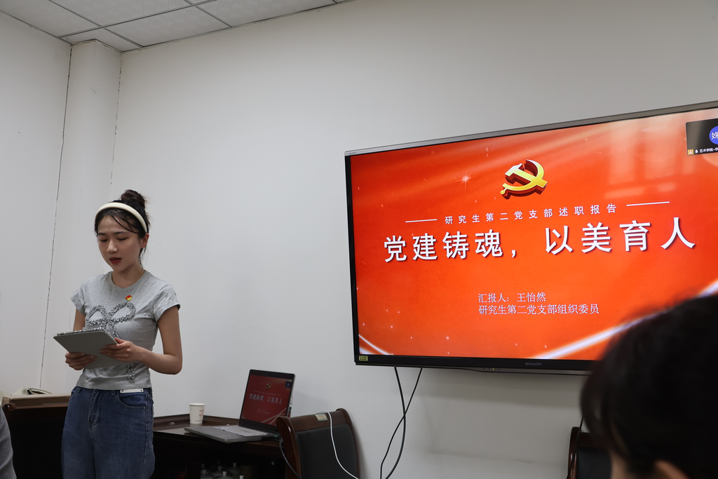 大会的第二个环节,听取和审议了上一届党支部委员会工作报告,报告全面回顾了过去三年支部在思想建设、作风建设、组织建设等方面取得的成效。上届研究生第一党支部组织委员任欢、研究生第二党支部组织委员王怡然分别作工作报告,总结上任以来的各项工作和成绩。研究生第一党支部坚持以“党建引领、学科发力、艺术赋能”为核心,不断探索“党建+美育”协同育人模式,注重制度建设与品牌活动双轮驱动,开展“党建领航,墨香入校”“图绘华夏梦,‘艺’路心连心”等特色活动,获“2023年度最佳党日活动”“2024年优秀研究生党支部”等荣誉,任欢代表上届委员会希望下一届支部委员会接续奋斗、守正创新,聚焦理论学习实效化、党员管理精细化、品牌建设专业化,探索“艺术+思政”融合新路径。研究生第二党支部立足专业实践,以“党建+美育”工作机制开展支部建设,紧密围绕新时代党的建设总要求和组织路线,从美术、音乐、戏剧三个维度创建党建品牌,通过“党建领航,墨香入校”“音乐思政讲座”“观看红色话剧《1912》”等多维活动达到党建与美育的双融双促效果。2024年支部也入选“桃花坞 研究生示范党支部领航计划”,王怡然代表上届委员会希望下一届支部委员会能进一步深化“实践育人”理念,推动党建与社会服务深度结合,提升党员服务社会的能力。