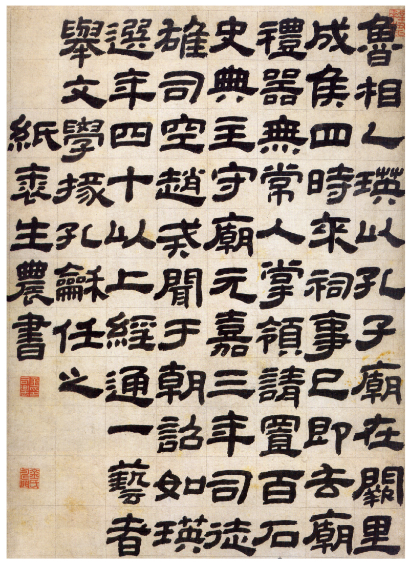 曲阜汉魏碑刻陈列馆,移置有两汉、魏、北朝众多碑刻;最为著名的隶书碑刻有西汉《五凤刻石》、东汉《乙瑛碑》《礼器碑》《史晨碑》《孔谦碑》《孔宙碑》《孔彪碑》《孔褒碑》,以及北魏的《张猛龙碑》。