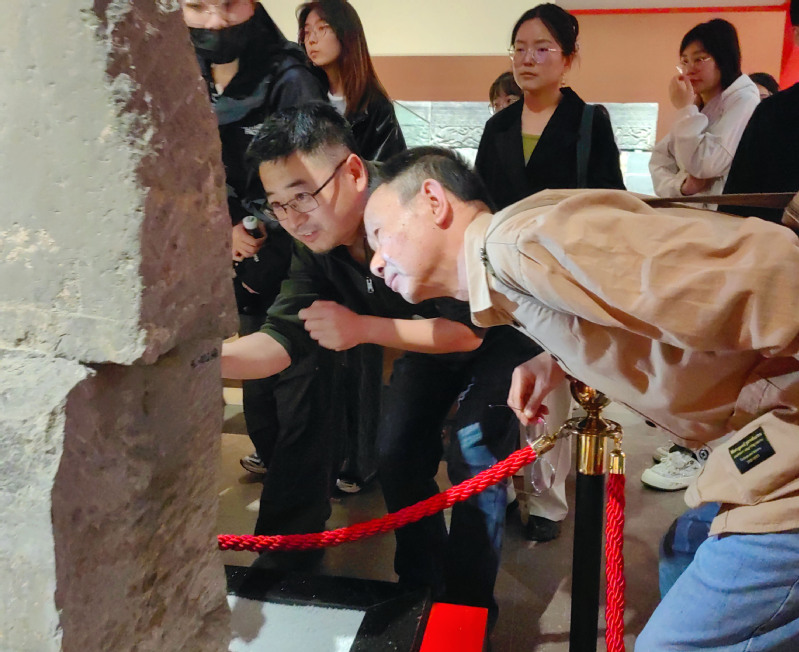 图(5)两位老师对气势恢宏的墓石画像透雕赞赏不已