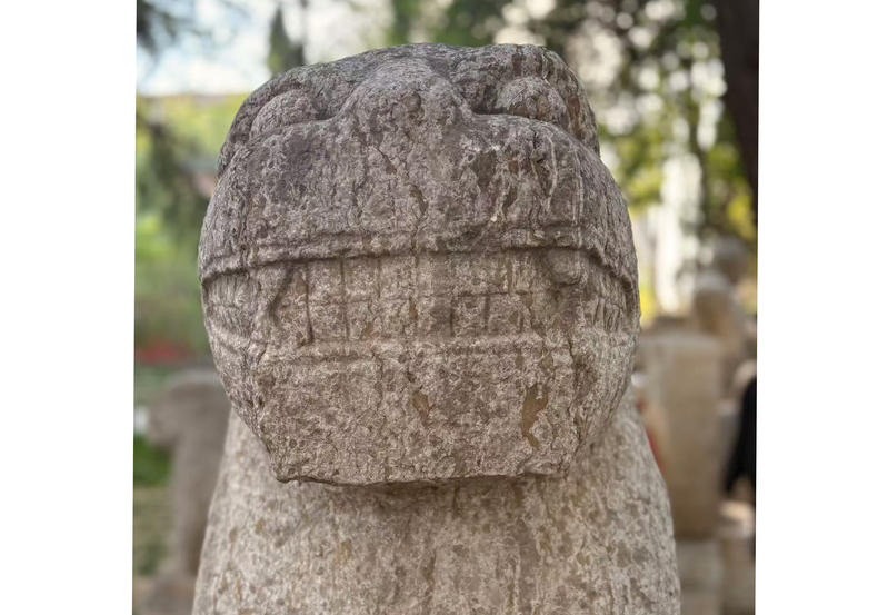 图(15)师生一行与太子灵踪塔旁的汉代呲牙石像合影