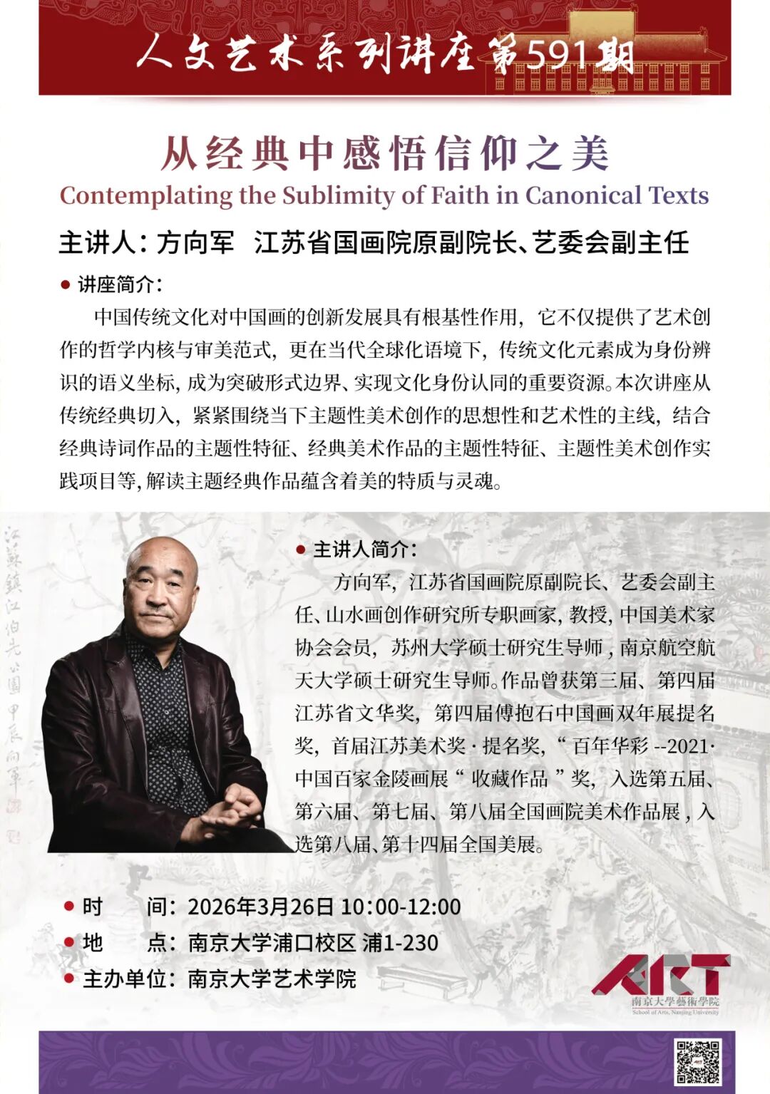 中国传统文化对中国画的创新发展具有根基性作用,它不仅提供了艺术创作的哲学内核与审美范式,更在当代全球化语境下,传统文化元素成为身份辨识的语义坐标,成为突破形式边界、实现文化身份认同的重要资源。本次讲座从传统经典切入,紧紧围绕当下主题性美术创作的思想性和艺术性的主线,结合经典诗词作品的主题性特征、经典美术作品的主题性特征、主题性美术创作实践项目等,解读主题经典作品蕴含着美的特质与灵魂。