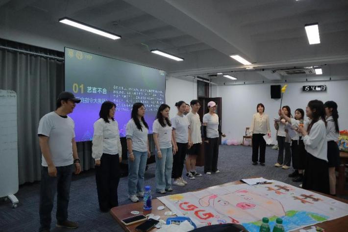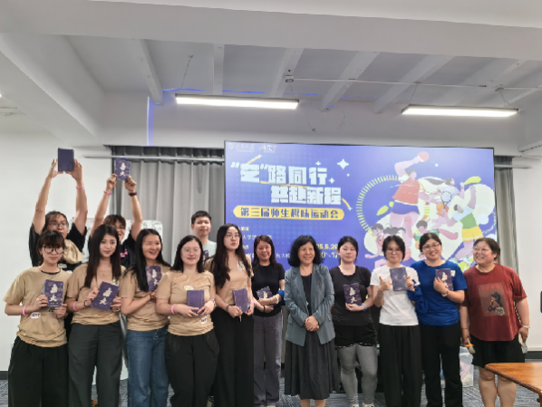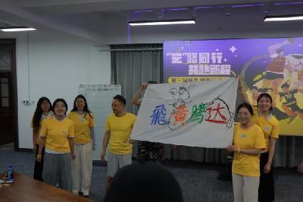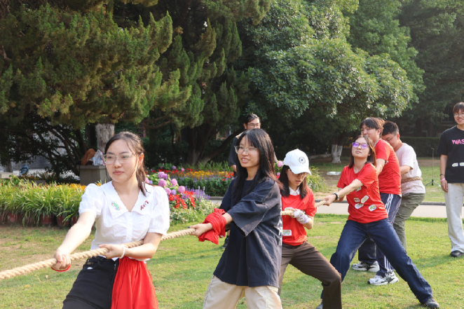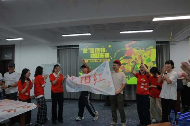 下午15:00,活动在热烈的氛围中拉开序幕,主持人详细介绍赛程安排与规则后,师生们迅速投身于组队、抽签环节。桃花坞 的教职工、博士研究生、硕士研究生自由组队,迅速组建起6支风格迥异的参赛队伍,各队充分发挥艺术特长,精心构思队名、绘制队旗,现场创意与欢乐齐飞。“飞黄腾达”队以一段热情奔放的热舞瞬间点燃全场气氛;“花式躺赢队”凭借幽默搞怪的姿态,引得众人捧腹大笑;“壮壮队”用创意十足的口号,成功吸引大家的目光;“兿隊”巧妙借用桃花坞 首字,将艺术与创意完美融合;“对对队”队员们默契配合、妙语连珠,上演了一场精彩的语言互动;“最美不过夕阳红”队身着亮眼的暖红色队服,宛如天边绚丽的晚霞,一亮相就成为焦点。各队各显神通,充分展现出桃花坞 师生昂扬向上、朝气蓬勃的精神面貌。随后,桃花坞 院长、党委副书记赵奎英宣布运动会开幕,将现场氛围推向高潮。