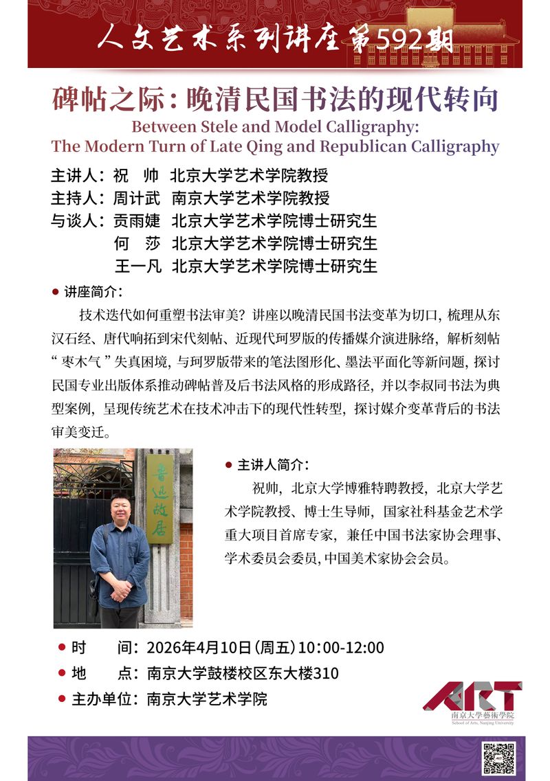 技术迭代如何重塑书法审美?讲座以晚清民国书法变革为切口,梳理从东汉石经、唐代响拓到宋代刻帖、近现代珂罗版的传播媒介演进脉络,解析刻帖“枣木气”失真困境,与珂罗版带来的笔法图形化、墨法平面化等新问题,探讨民国专业出版体系推动碑帖普及后书法风格的形成路径,并以李叔同书法为典型案例,呈现传统艺术在技术冲击下的现代性转型,探讨媒介变革背后的书法审美变迁。