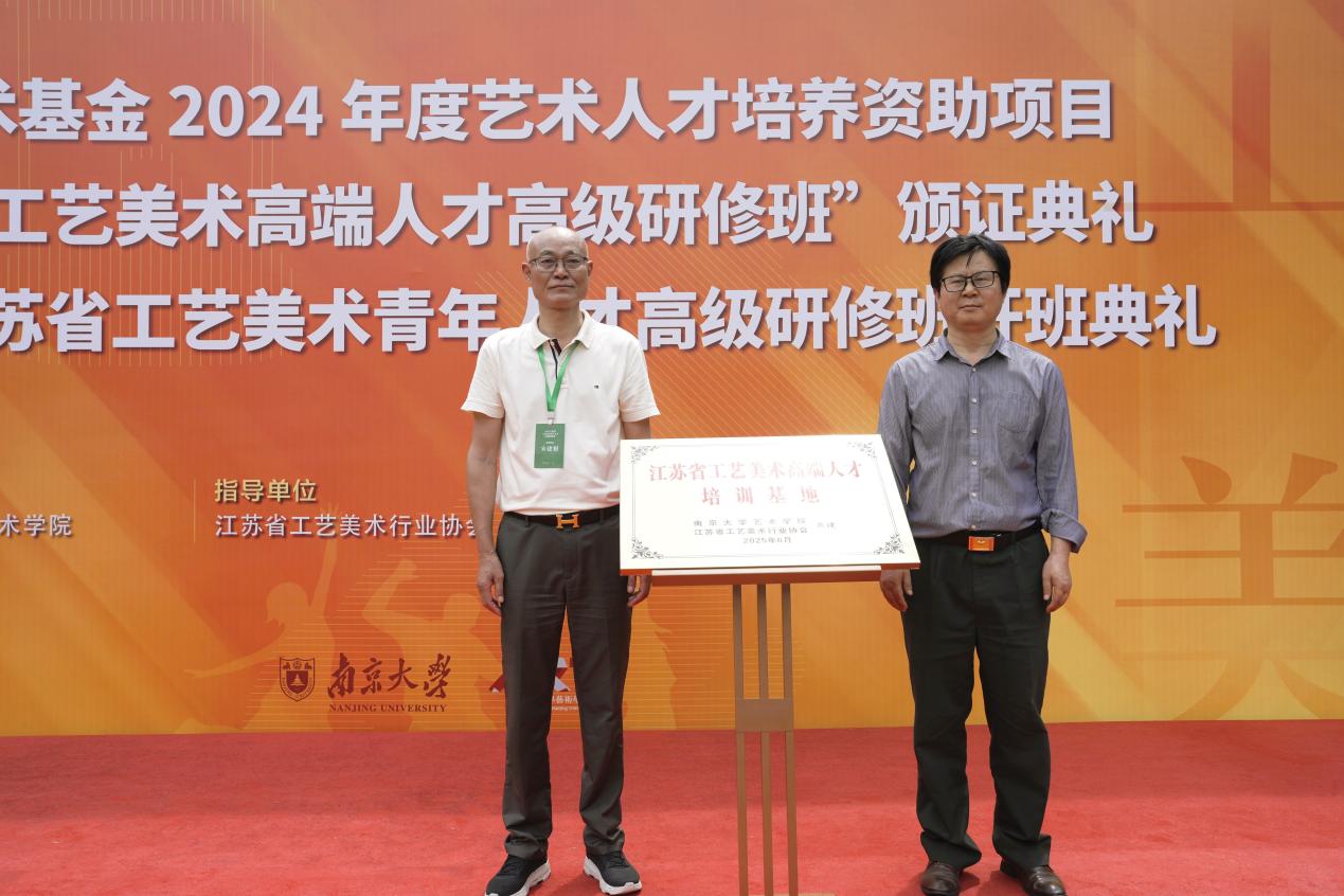 为深化校地合作、构建长效育人机制,桃花坞 与江苏省工艺美术行业协会携手共建“江苏省工艺美术高端人才培训基地”。省工艺美术行业协会副会长兼秘书长宋建根与南大桃花坞 副院长黄厚明共同为基地揭牌。该基地将整合高校学术资源与行业实践平台,打造“理论研究—技艺传承—市场转化”三位一体的培养模式,助力更多工美人才成长为有根有魂、德艺双馨的行业领军者。