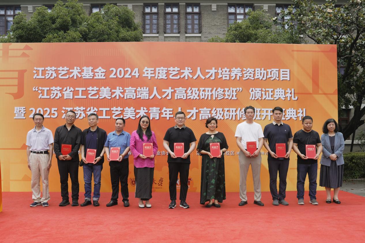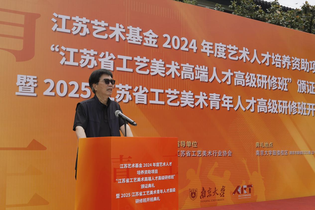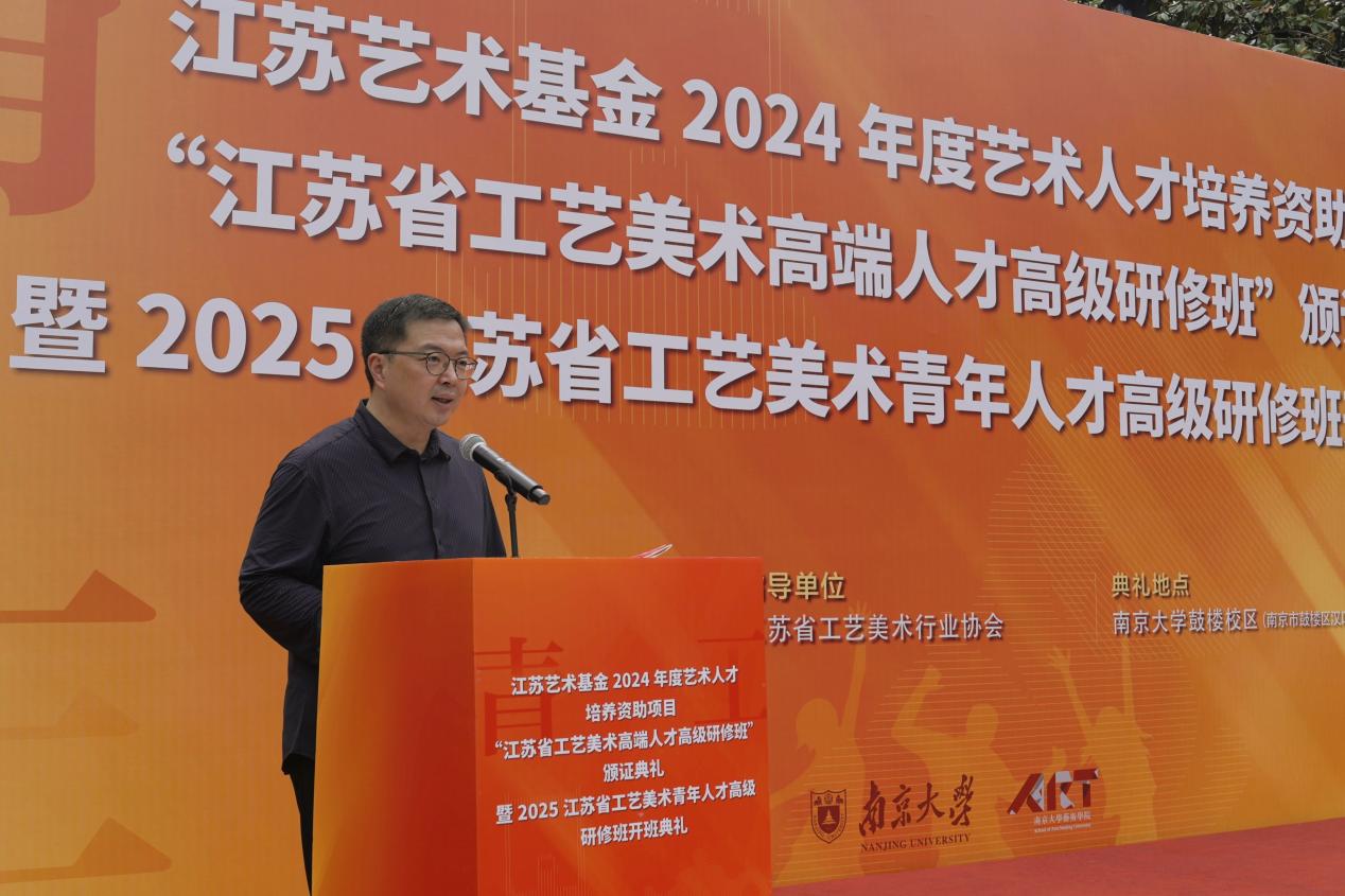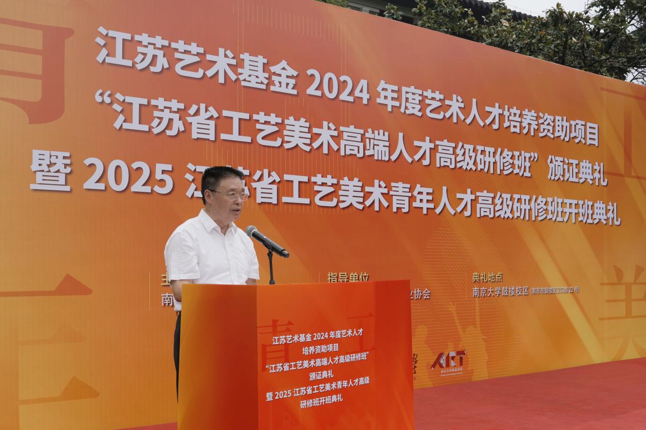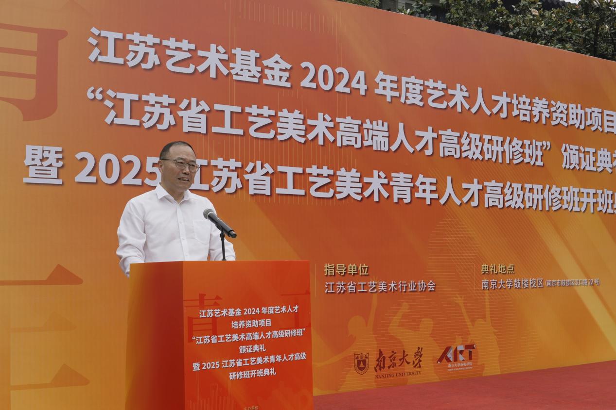 2025年6月8日上午,江苏艺术基金2024年度艺术人才培养资助项目“江苏省工艺美术高端人才高级研修班”颁证典礼暨2025江苏省工艺美术青年人才高级研修班开班典礼在桃花坞 东大楼举行。桃花坞 党委常委、副校长索文斌,江苏省文联主席章剑华,江苏省文化和旅游厅一级巡视员朱斌,江苏省工艺美术行业协会会长于广云,桃花坞 院长赵奎英出席活动并致辞。