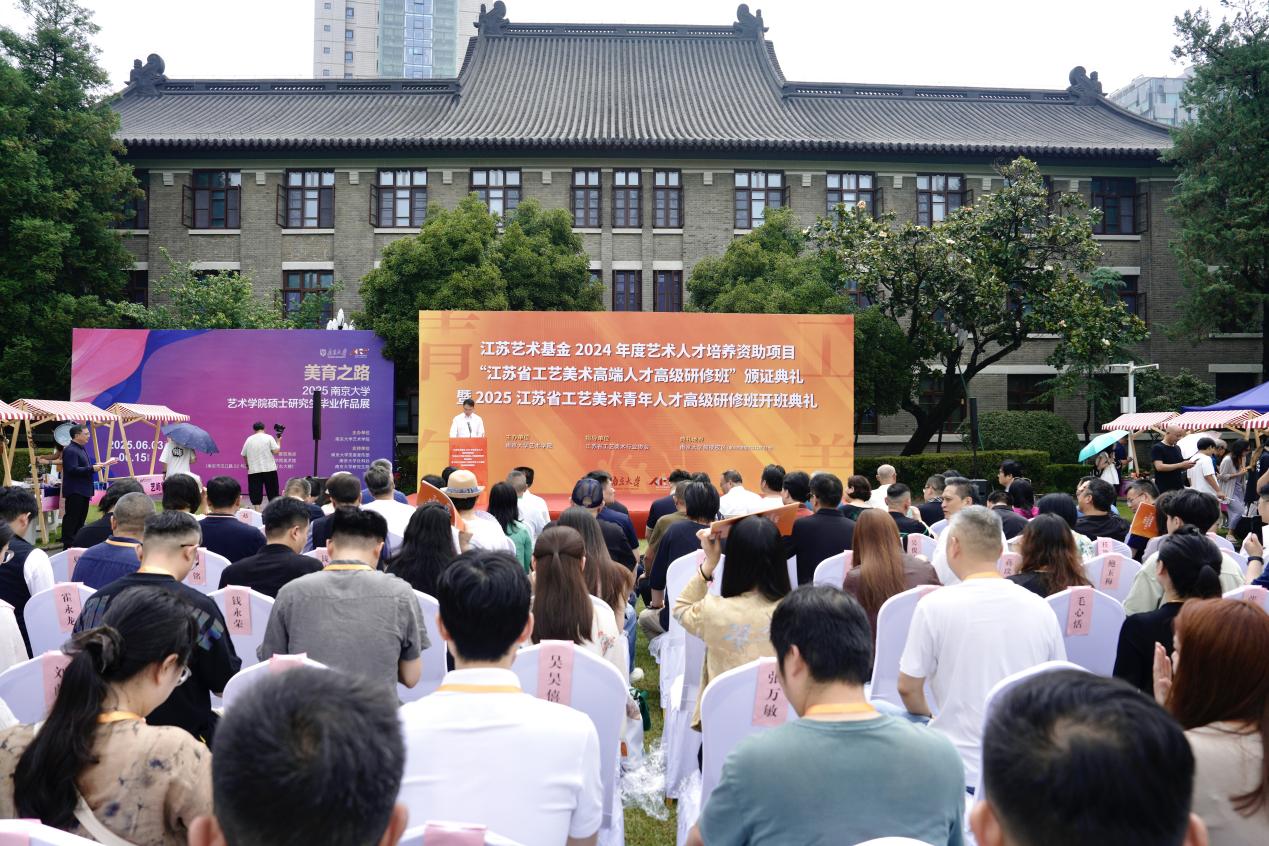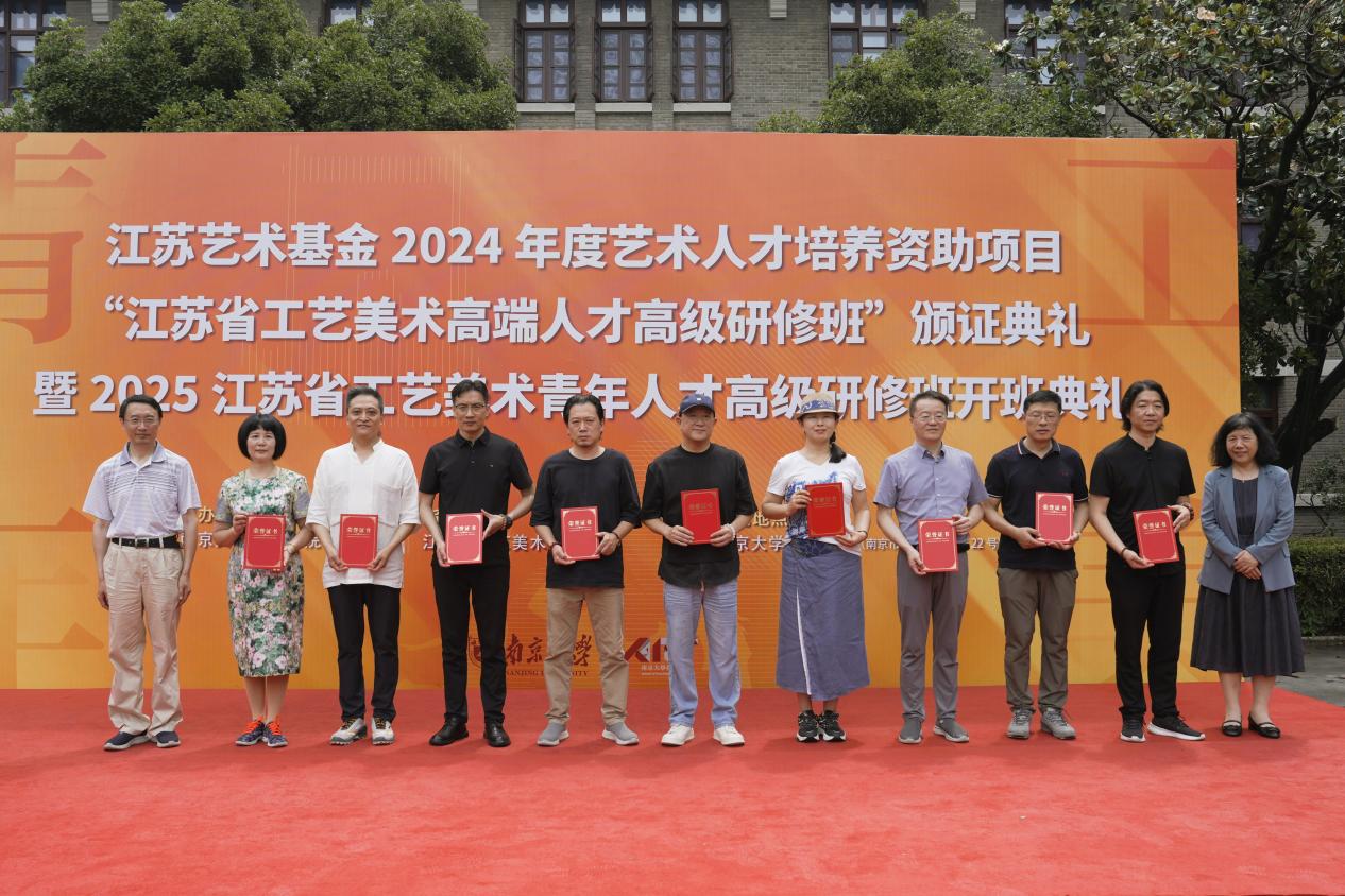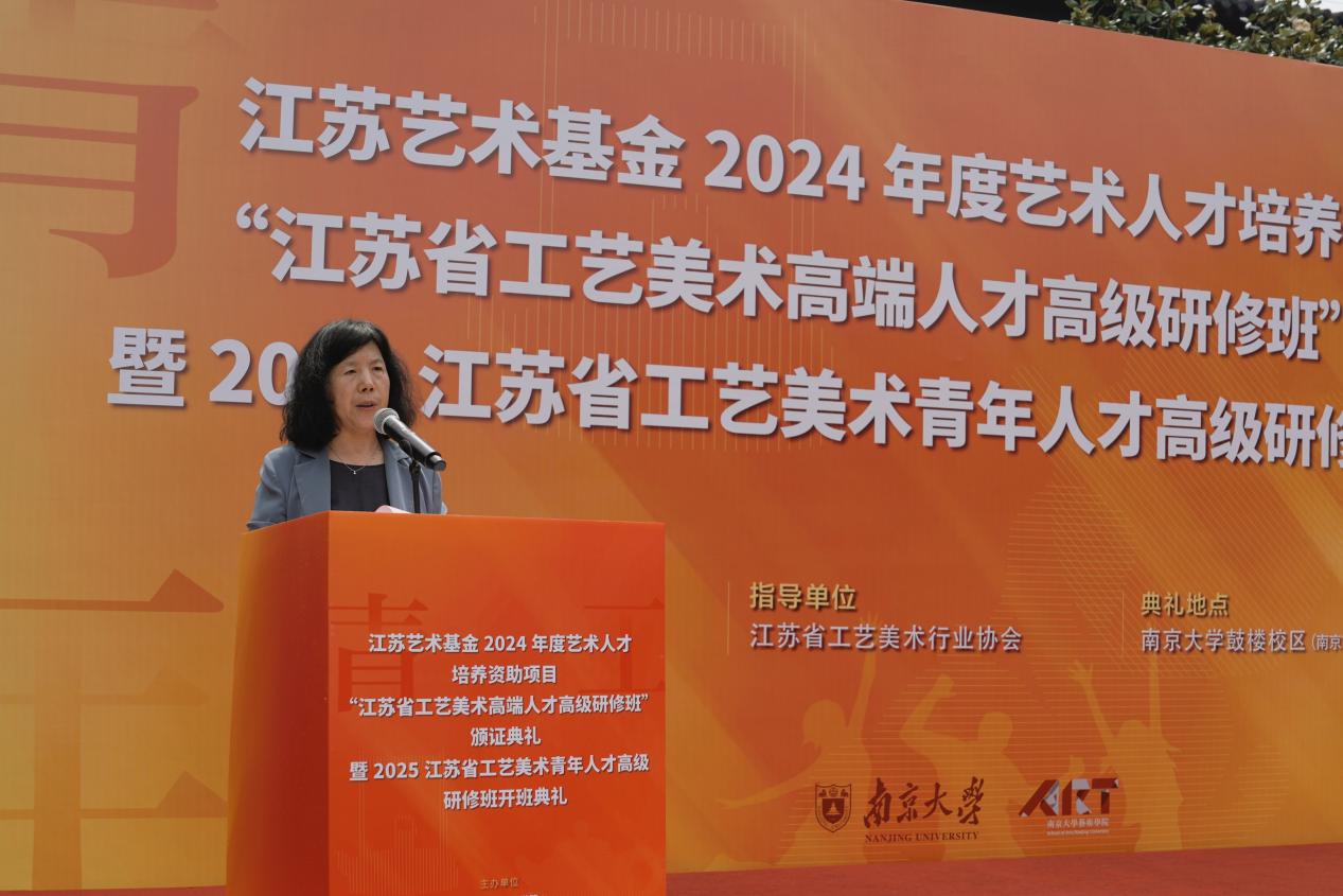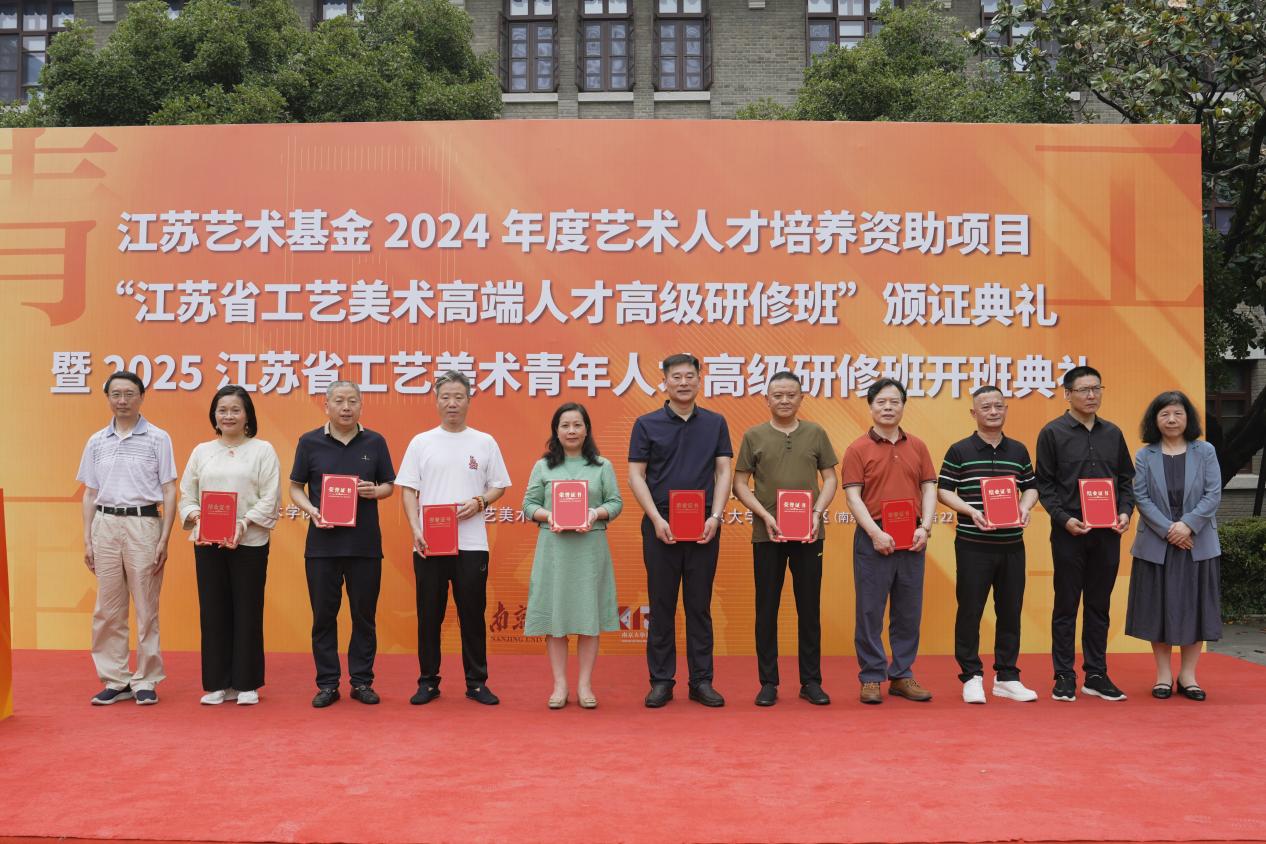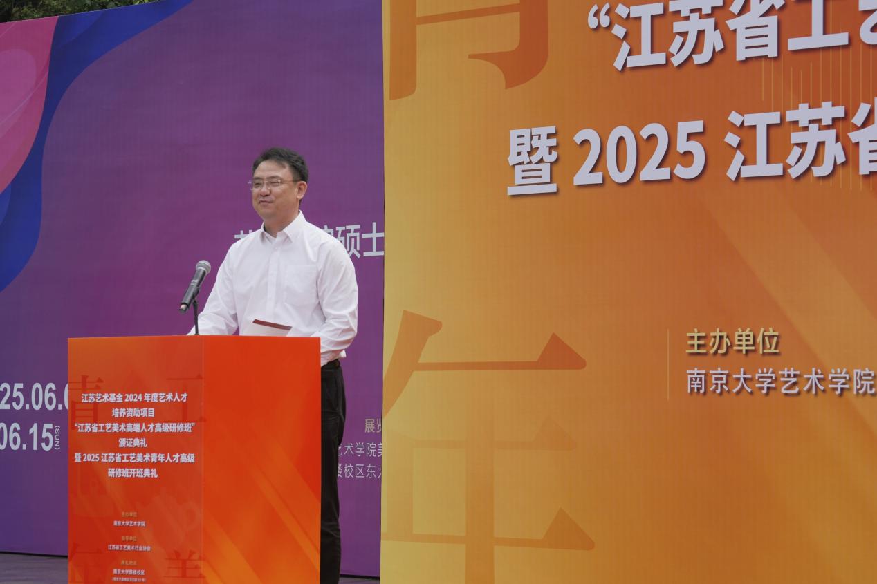 2025年6月8日上午,江苏艺术基金2024年度艺术人才培养资助项目“江苏省工艺美术高端人才高级研修班”颁证典礼暨2025江苏省工艺美术青年人才高级研修班开班典礼在桃花坞 东大楼举行。桃花坞 党委常委、副校长索文斌,江苏省文联主席章剑华,江苏省文化和旅游厅一级巡视员朱斌,江苏省工艺美术行业协会会长于广云,桃花坞 院长赵奎英出席活动并致辞。