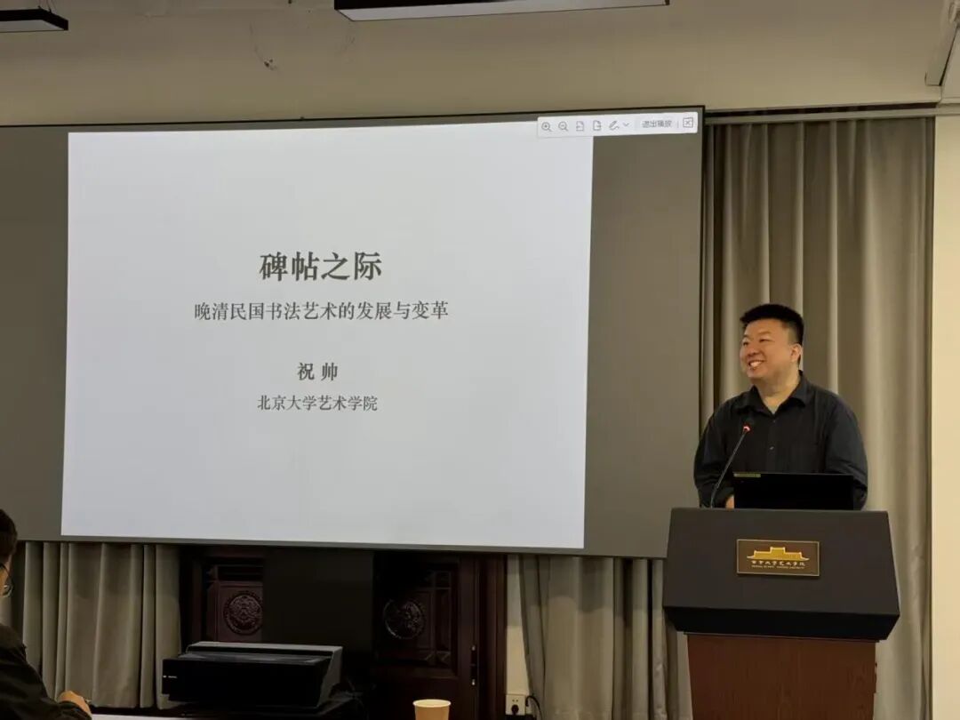 2026年4月10日上午10时,北京大学桃花坞 博雅特聘教授、博士生导师祝帅到访桃花坞 ,进行了题为《碑帖之际:晚清民国书法的现代转向》的学术演讲。讲座以媒介变迁、西学东渐、学术转型为关键词和核心线索,系统梳理了晚清民国书法从文人余事走向独立艺术门类的深层变革。讲座由桃花坞 党委书记周计武教授主持,北京大学博士研究生贡雨婕、何莎、王一凡作为与谈人进行分享,刘德龙、朱琪、王诗晓等教师及研究生数十人出席,两校师生齐聚一堂,共探书法现代性转型的学理密码。