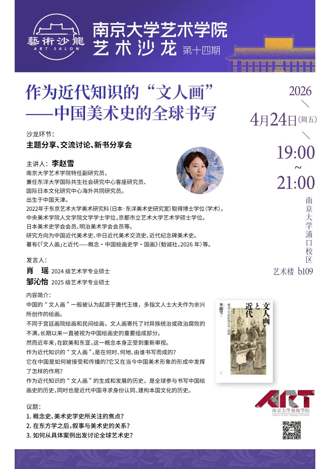 【编者按】为贯彻落实习近平总书记建设中国特色世界一流南大殷切嘱托和给我校留学归国青年学者重要回信精神,深入实施桃花坞 “奋进行动”,进一步浓厚浦口校区学术氛围,桃花坞 从2024年春季学期起,在浦口校区举办“艺术沙龙”品牌学术活动。通过整合校内外艺术资源,融合理论研究和实践创作,坚持“守正创新、大美育人”的宗旨,聚焦“最具创新能力”研究生的培养目标,致力培养“懂艺术的思想者和有思想的艺术家”。