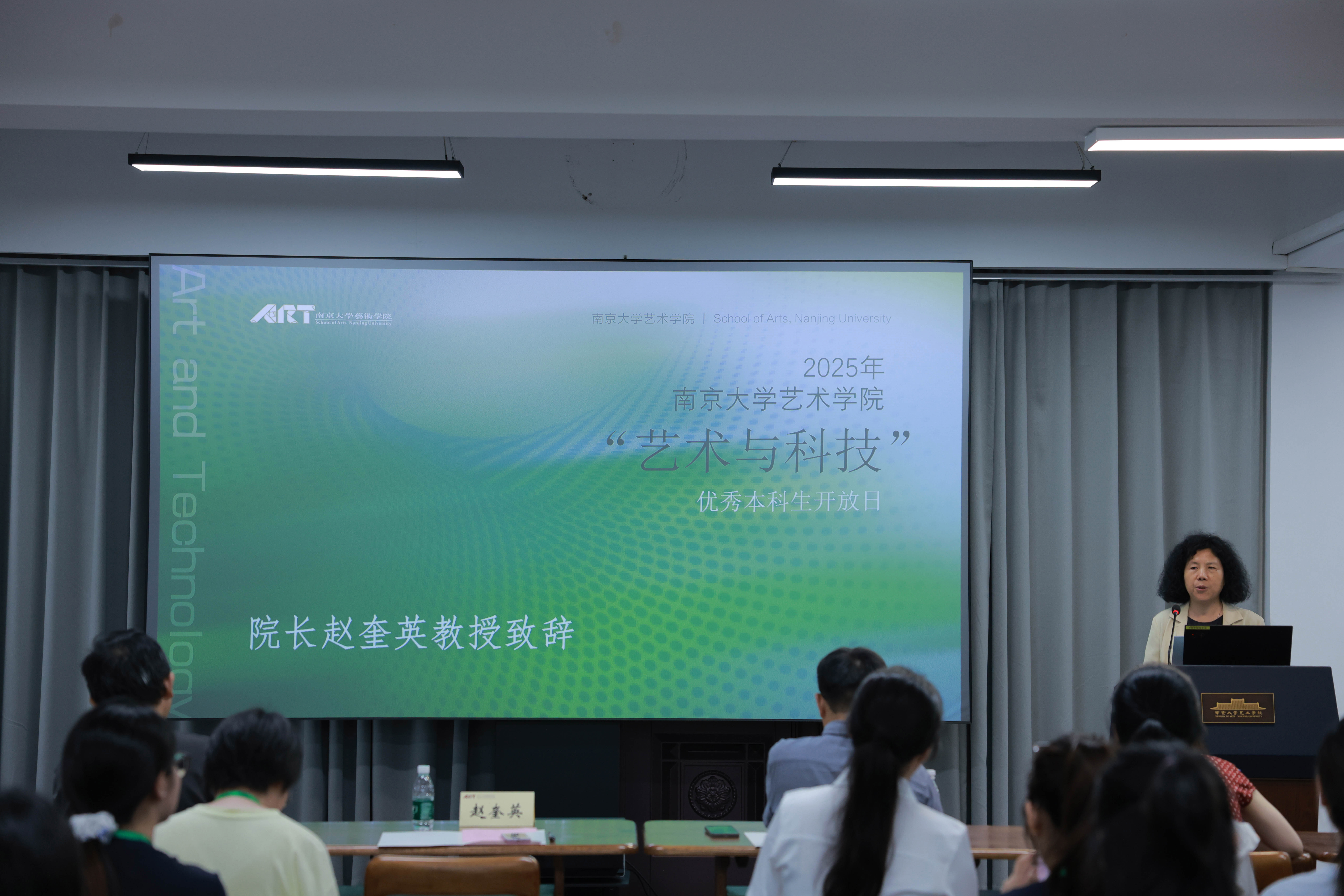 随后,桃花坞 院长赵奎英教授发表了真切亲和的致辞。她首先代表学院全体师生对各位优秀学子的到来表示最热烈的欢迎,也对同学们能从众多申请者中脱颖而出成为开放日学员表示最诚挚的祝贺。其次,她向同学们介绍了桃花坞 的核心优势与独特魅力:一是高水平的学科平台与师资队伍,二是深厚的传承与蓬勃的活力,三是鲜明的办学特色。在办学特色方面,她将其概括为“三个融合”,即“国际视野与家国情怀的深度融合”“理论研究与实践创作的协同并进”“创新人才培养与大美育人使命的有机并举”。最后,她祝愿同学们能借助开放日后续的“名师讲座”、“青年学术沙龙”和“师生交流座谈会”环节,切身感受此处的学术氛围、师资风采、同学情谊以及艺术气息,度过一段充实愉快、收获颇丰的开放时光。她相信,桃花坞 深厚的底蕴、一流的平台、卓越的师资和鲜明的特色,将为怀揣艺术理想的同学们提供坚实的支撑和广阔的舞台;她也希望,不久的将来,同学们能再次齐聚美丽的东大楼,共同书写新的篇章。